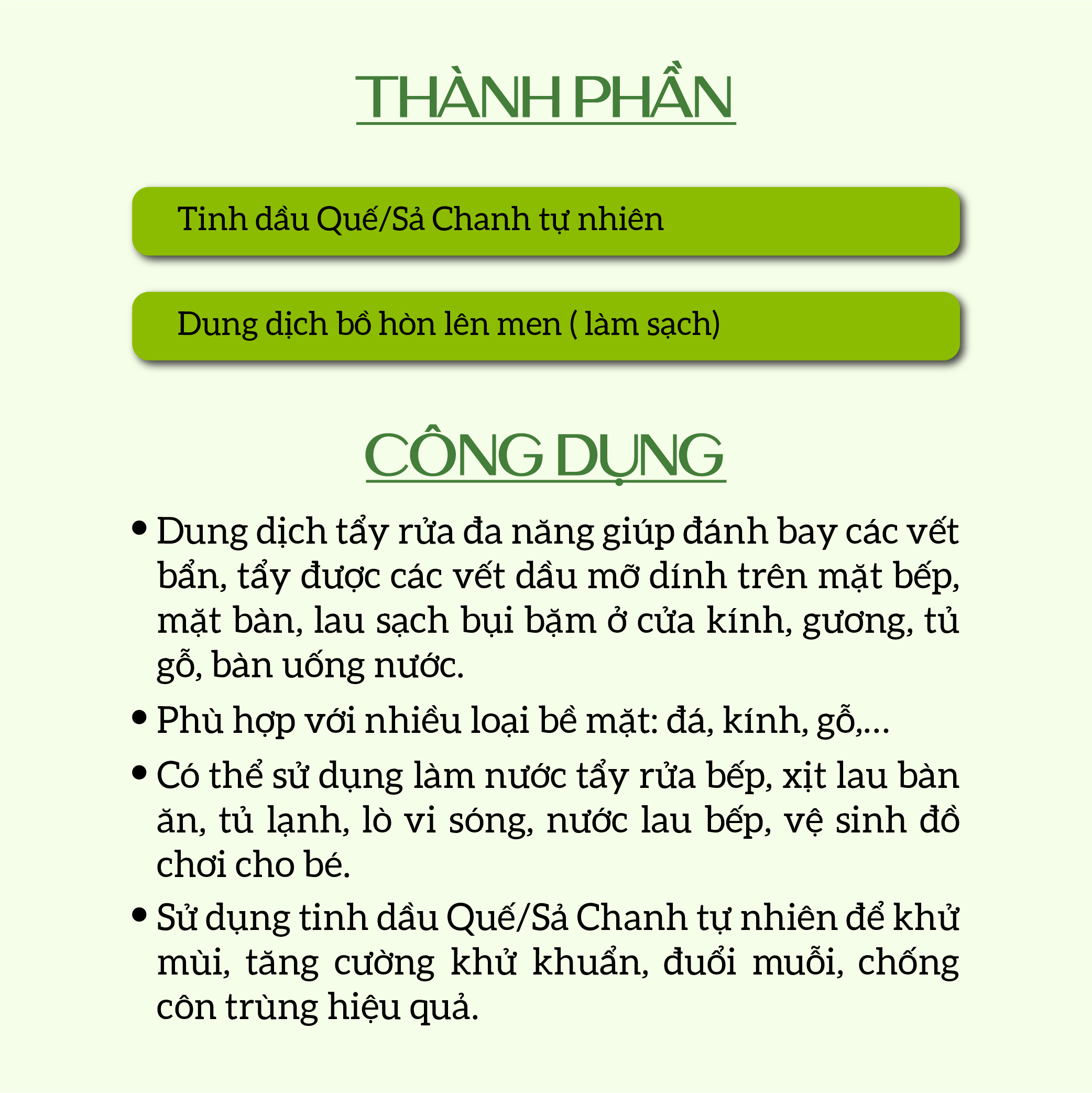 - 0% Hóa chất độc hại – Thành phần: Nước Bồ hòn lên men tự nhiên (tạo bọt và làm sạch), Tinh dầu Quế tự nhiên. Dung môi thiên nhiên, nước tinh khiết – Chỉ tiêu chất lượng: Không kích ứng da