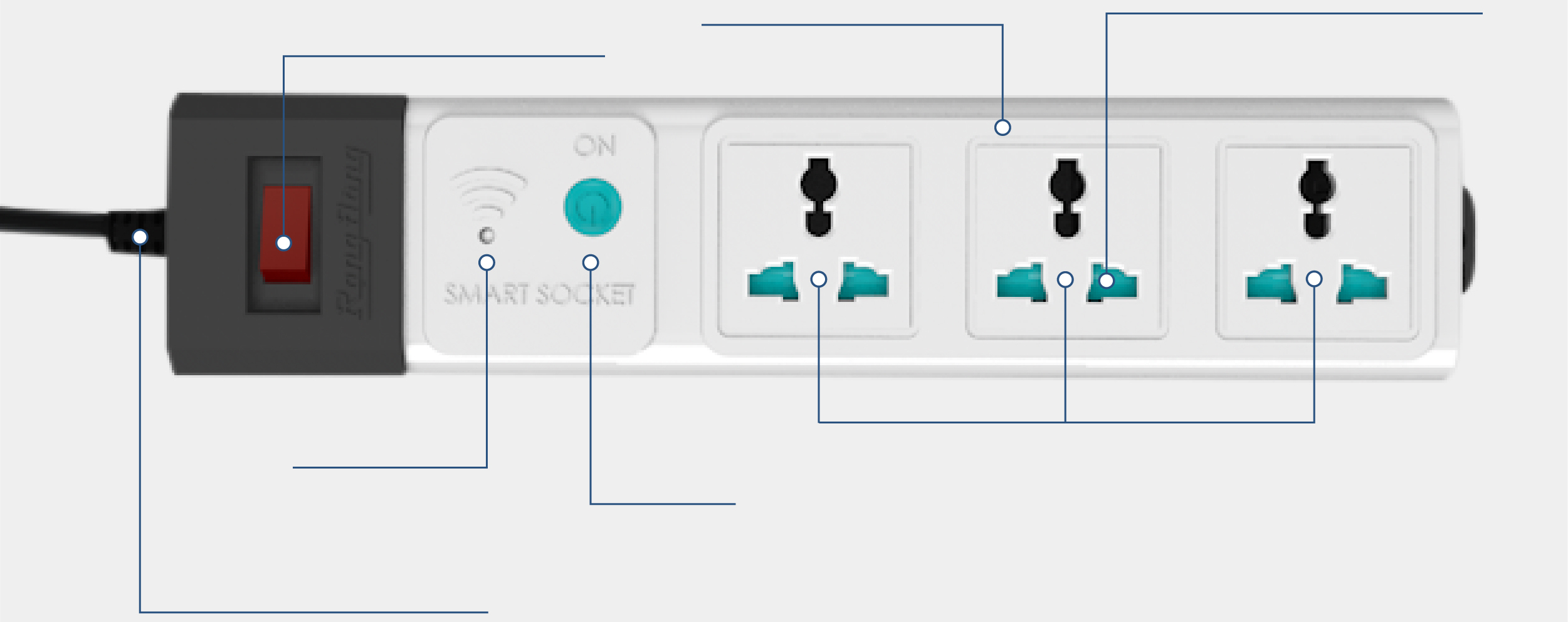 Ổ cắm thông minh Wifi 5m Model: 3C/5M/10A Tìm sản phẩm tương tự Dải điện áp hoạt động: (150-250)V/50Hz Dòng điện ổ cắm tối đa: 10A Công suất ổ cắm tối đa: 2500W Số chu