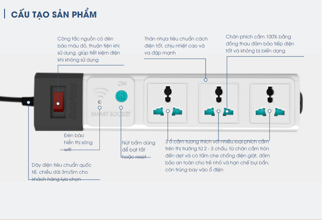 - Bảo vệ an toàn chống xung điện áp cao, xung sét. - Công tắc tích hợp rơ le chống quá tải 15A. - Ổ cắm đa năng sử dụng đồng chuyên dụng siêu đàn