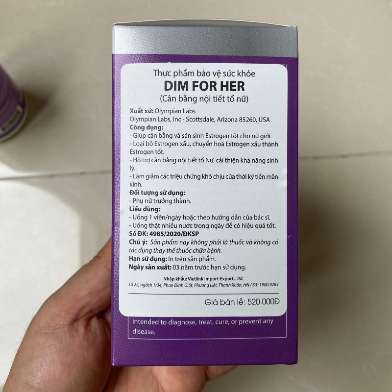 Địa chỉ tổ chức chịu trách nhiệm sản xuất: 21410 N 15TH LN STE 114 Phoenix, AZ 85027, United States America (USA). Mô tả sản phẩm Olympian Labs DIM For Her 250MG là sản phẩm hỗ trợ cân bằng nội tiết tố nữ, được sản xuất bởi thương hiệu Olympian Labs từ năm 1992 tại bang Arizona, Mỹ. Sản phẩm chứa Diindolylmethane (DIM), một hợp chất tự nhiên có trong các loại rau họ cải như bông cải xanh, cải Brussels và cải bắp, giúp hỗ trợ cân bằng estrogen và testosterone trong cơ thể. Thành phần