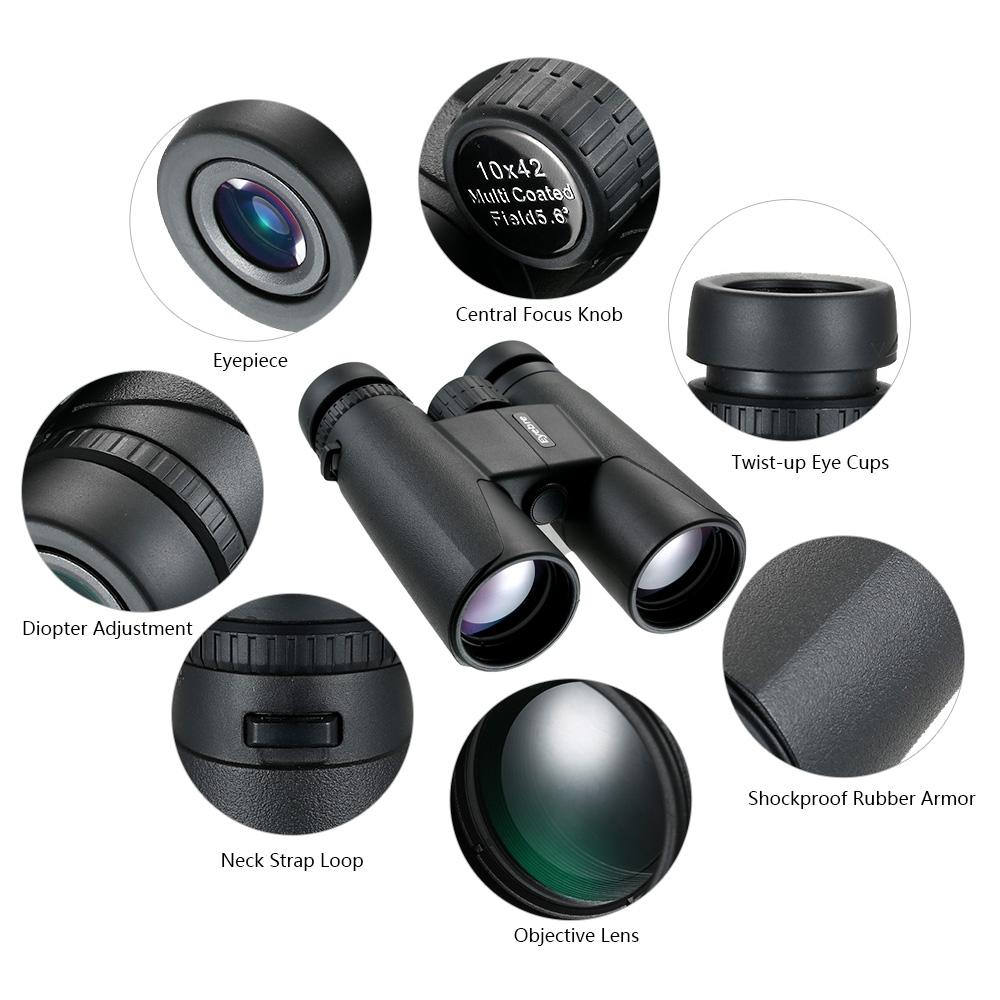 This compact and lightweight binocular is coated with green film and 10X magnification, which can provide you with brighter view, great for outdoor hunting, bird watching, hiking, sporting events and other activities.