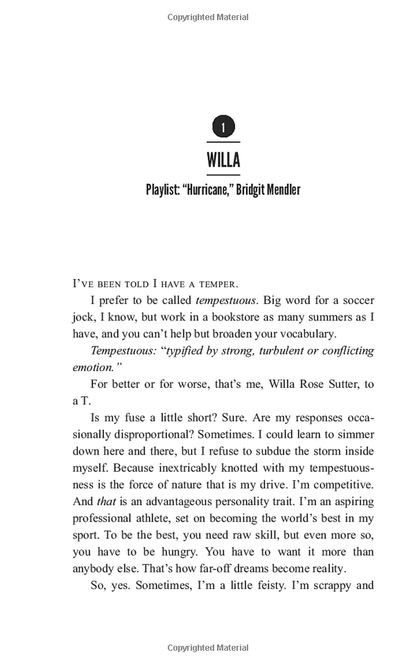 Ever since she sat next to me in class and gave me death eyes, Willa Sutter's been on my shit list. Why she hates me, I don't know. What I do know is that Willa is the kind of chaos I don't need in my tidy life. She's the next generation of women's soccer. Wild hair, wilder eyes. Bee-stung lips that should be illegal. And a temper that makes the devil seem friendly.