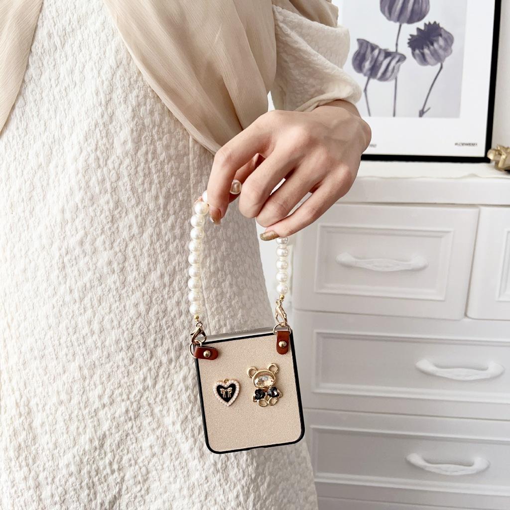 ✨Ốp Lưng Da Cho Samsung Galaxy Z Flip 6 / Z Flip 5 Hình Chú Gấu Kèm Dây Ngọc Trai Ngắn - BUM STORE GALAXY CASE