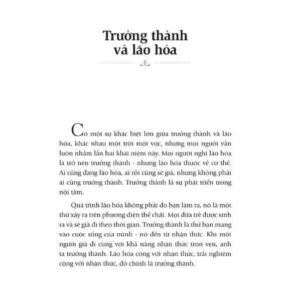 - Osho nhấn mạnh rằng “già đi” là sự thay đổi của cơ thể, nhưng “trưởng thành” là sự phát triển sâu sắc của nội tâm. Trưởng thành không phải là một tiến trình hướng đến mục tiêu bên ngoài mà là hành trình khám phá bản thân, sống trọn vẹn và nhận thức trong mỗi khoảnh khắc.