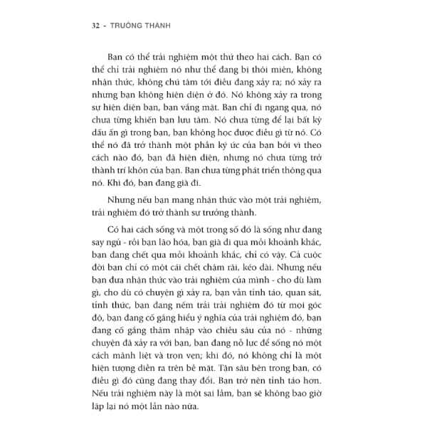 "Trưởng Thành - Chạm Tới Bầu Trời Nội Tâm Của Bạn" là một cuốn sách sâu sắc của Osho, một trong những bậc thầy tâm linh nổi tiếng nhất thế kỷ 20. Cuốn sách này không chỉ đề cập đến quá trình lão hóa tự nhiên mà còn khám phá khái niệm trưởng thành, điều mà nhiều người trong chúng ta thường bỏ qua hoặc không hiểu hết.