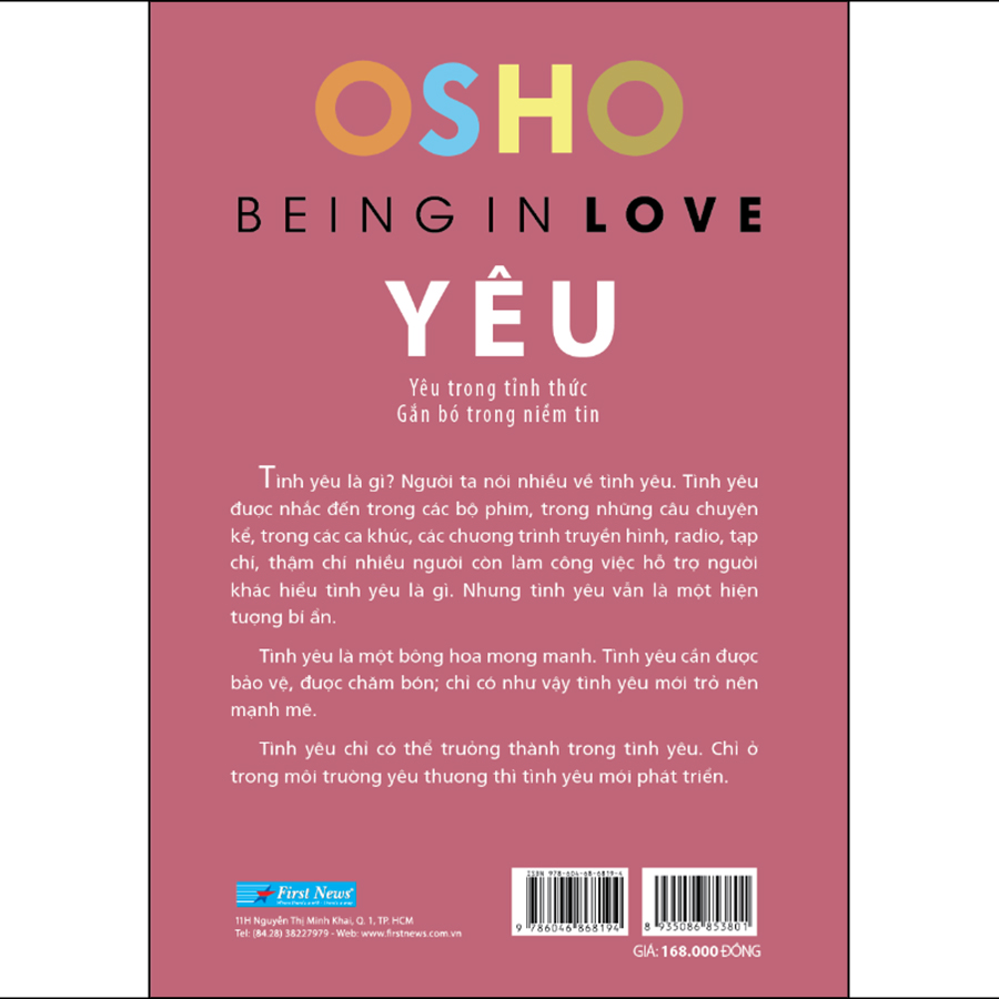 Chúng ta thường sợ hãi khi nghĩ về tình yêu, ta e ngại những nỗi đau lẫn rắc rối mà nó đem đến. Với “Yêu”, bằng giọng văn cá tính và cuốn hút đặc trưng, Osho đem đến sự thấu hiểu trọn vẹn về tình yêu, đồng thời truyền niềm tin và sự dũng cảm để bạn đọc bước vào trải nghiệm phức tạp này một cách mới mẻ trong thứ ánh sáng tỉnh thức của tâm linh. “Tình yêu chỉ có thể trưởng thành trong tình yêu”, ông nói, “Có điều gì đó thật đẹp đang chờ bạn phía trước. Nếu bạn có thể chờ đợi, nếu bạn có đủ kiên nhẫn và có thể tin tưởng, nó sẽ đến”.