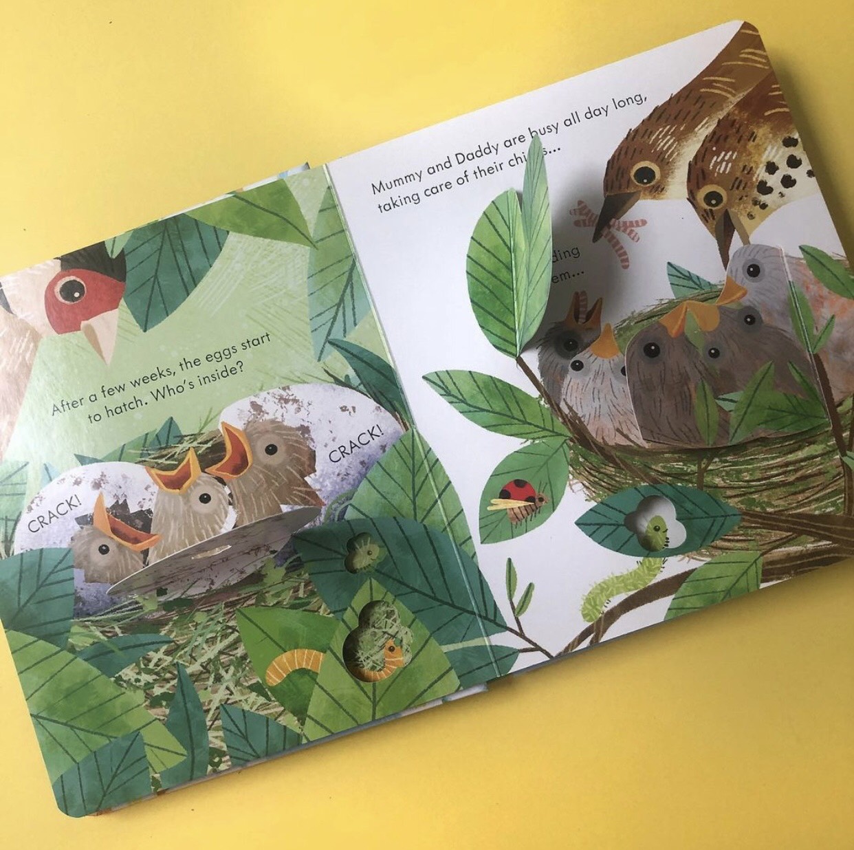 Peep inside a bird's nest to see her precious eggs nestled there. Lift a flap to see them hatch, and find out how a bird takes care of its young. Discover all kinds of different