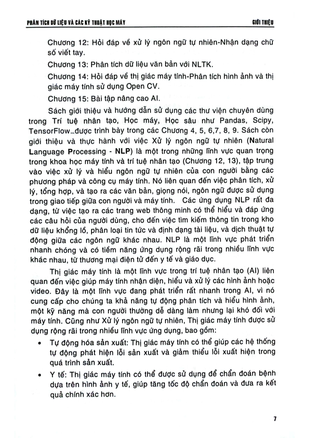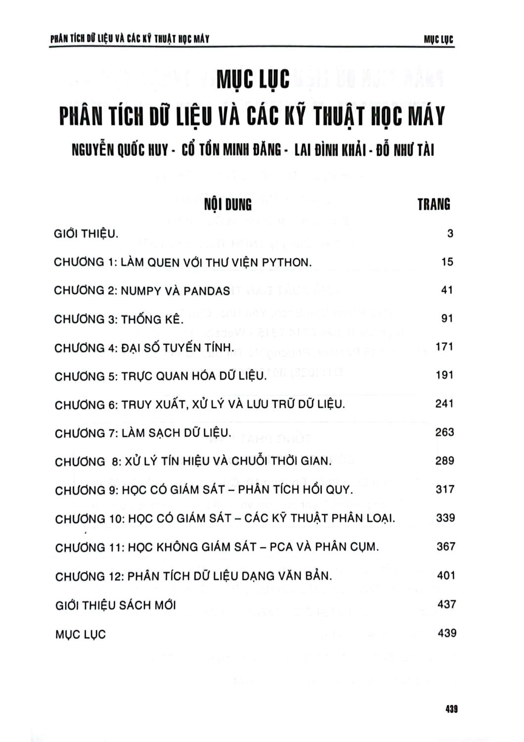 Phân Tích Dữ Liệu Và Các Kỹ Thuật Học Máy Có thể xem đây là tập tiếp theo sách KHOA HỌC DỮ LIỆU VỚI CÁC KỸ THUẬT HỌC MÁY (CƠ BẢN) ở mức độ chuyên sâu giới thiệu các công cụ Toán như Thống Kê, Đại số tuyến tính, Lý thuyết cơ bản về học máy, Cách thức các thuật toán học máy cụ thể hoạt động và nhiều hơn nữa mà các sinh viên chuyên ngành học về môn học này cần được trang bị. Sách giới thiệu nhanh về các thành phần thiết yếu của ngôn ngữ Python dành cho các nhà nghiên cứu và nhà phát triển Phân tích dữ liệu, học máy và học sâu. Nền tảng học máy vững chắc được trình bày bởi chuyên gia. Toàn bộ vòng đời phát triển học máy được áp dụng cho các dự án cấp doanh nghiệp. Bao gồm mã hóa Python, điện toán khoa học, thuật toán tối ưu hóa, AI có thể giải thích và các phương pháp tiên tiến hướng đến sự đơn giản, khả năng mở rộng, khả năng tái sử dụng, khả năng nhân rộng, triển khai nhanh và bảo trì dễ dàng. Từ làm sạch dữ liệu đến thiết kế mô hình, thử nghiệm và lựa chọn tính năng, cho đến những hình ảnh trực quan tuyệt vời dễ dàng cho các bên liên quan và người ra quyết định. Tùy thuộc vào nền tảng và sở thích của sinh viên, các chủ đề có thể bao gồm dữ liệu tăng cường, mô hình tổng quát và hỗn hợp, dữ liệu lớn, mạng thần kinh sâu, Nhiều thuật toán học máy được trình bày. Nội dung sách trình bày qua 440 trang khổ 16 x 24 cm với 12 chương. Chương 1: Làm quen với Python và thư viện. Chương 2: Tổng quan về Trí tuệ nhân tạo, Khoa học dữ liệu, Học máy và Học sâu. Chương 3: Thống kê. Chương 4: Đại số tuyến tính. Chương 5: Trực quan hóa dữ liệu. Chương 6: Truy xuất, xử lý và lưu trữ dữ liệu. Chương 7: Làm sạch dữ liệu. Chương 8: Xử lý tín hiệu và chuỗi thời gian. Chương 9: Học có giám sát – Phân tích hồi quy. Chương 10: Học có giám sát – Các kỹ thuật phân loại. Chương 11: Học không giám sát – Pca và phân cụm. Chương 12: Phân tích dữ liệu dạng văn bản.