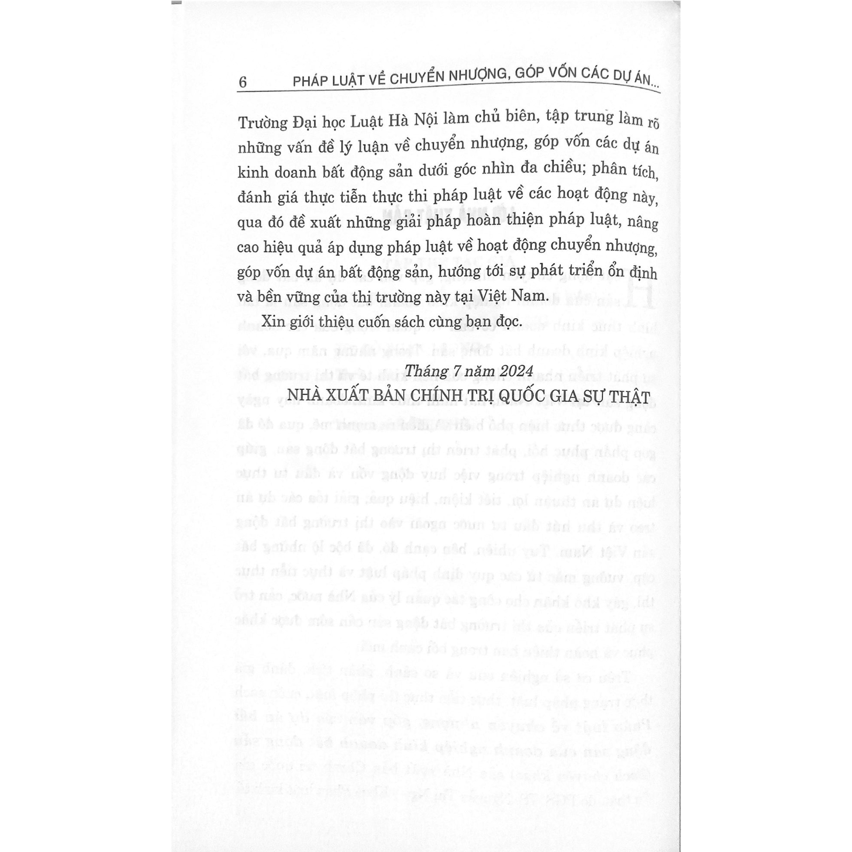 Trên cơ sở nghiên cứu và so sánh, phân tích, đánh giá thực trạng pháp luật, thực tiễn thực thi pháp luật, cuốn sách Pháp luật về chuyển nhượng, góp vốn các dự án bất động sản của doanh nghiệp kinh doanh bất động sản (Sách chuyên khảo) của Nhà xuất bản Chính trị quốc gia Sự thật, do PGS. TS. Nguyễn Thị Nga - Khoa Pháp luật kinh tế, Trường Đại học Luật Hà Nội làm chủ biên, tập trung làm rõ những vấn đề lý luận về chuyển nhượng, góp vốn các dự án kinh doanh bất động sản dưới góc nhìn đa chiều; phân tích, đánh giá thực tiễn thực thi pháp luật về các hoạt động này, qua đó đề xuất những giải pháp hoàn thiện pháp luật, nâng cao hiệu quả áp dụng pháp luật về hoạt động chuyển nhượng, góp vốn dự án bất động sản, hướng tới sự phát triển ổn định và bền vững của thị trường này tại Việt Nam.