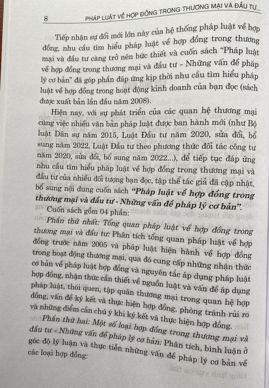 Trên cơ sở phân tích, bình luận các quy định của luật thương mại năm 2005 ,bộ luật dân sự năm 2005 cùng các văn bản pháp luật có liên quan đến chế định hợp đồng thương mại và đầu tư cuốn sách chuyên khảo pháp luật về hợp đồng trong thương mại và đầu tư cuốn sách chuyên khảo” Pháp Luật Về Hợp Đồng Trong Thương Mại Và Đầu Tư-Những Vấn Đề Pháp Lý Cơ Bản do TS. Nguyễn Thị Dung làm chủ biên, đã được xuất bản lần đầu năm 2008 và được tái bản lần thứ nhất năm 2009,lần thứ hai năm 2019,Lần thứ ba năm 2020 góp phần đáp ứng nhu cầu của bạn đọc trong tìm hiểu và áp dụng thương mại và đầu tư trong cuộc sống hằng ngày Trong lần xuất bản Thứ tư này cuốn sách để được các tác giả chỉnh sửa và cập nhật quy định liên quan đến chế định hợp đồng của Luật thương mại năm 2005 sửa đổi bổ sung năm 2017,2019, luật doanh nghiệp 2020 sửa đổi bổ sung năm 2022 được đầu tư 2020 sửa đổi bổ sung năm 2022 luật đầu tư theo phương thức đối tác công tư năm 2020 sửa đổi bổ sung năm 2022 ,bộ luật dân sự 2015 …cùng các văn bản hướng dẫn thi hành .Cuốn sách cung cấp cho bạn đọc những kiến thức chuyên sâu, cụ thể về các loại hợp đồng cơ bản trong hoạt động thương mại và đầu tư tại nước ta cũng rất cũng giới thiệu những kỹ năng cơ bản khi soạn thảo hợp đồng cùng các mẫu hợp đồng phổ biến trong hoạt động thương mại và đầu tư sức các bên trong hoạt động phòng tránh được những rủi ro pháp lý giảm thiểu các tranh chấp trong hợp đồng kinh doanh Luatvietbook xin trân trọng giới thiệu đến bạn đọc!