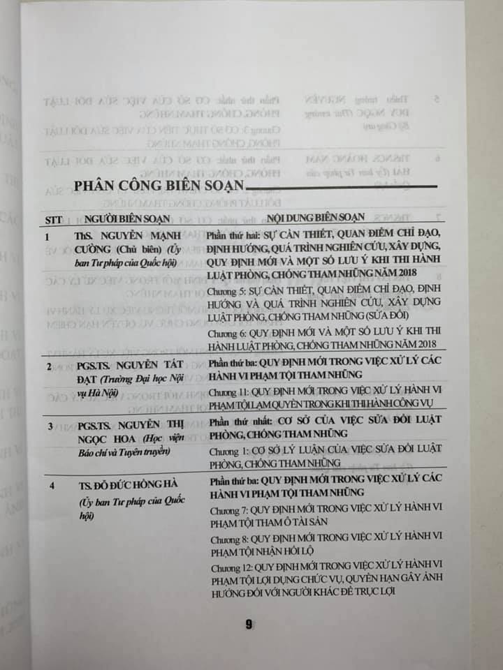 Để hiểu thêm về đạo luật Phòng, chống tham nhũng có hiệu lực từ ngày 1/7/2019 và để góp phần đưa bộ luật này sớm đi vào cuộc sống, Nhóm tác giả đã biên soạn cuốn: Pháp luật về phòng, chống tham nhũng và xử lý các hành vi phạm tội. Ngoài lời giới thiệu, danh mục tài liệu tham khảo, cuốn sách gồm 3 phần, 13 chương và 4 phụ lục: