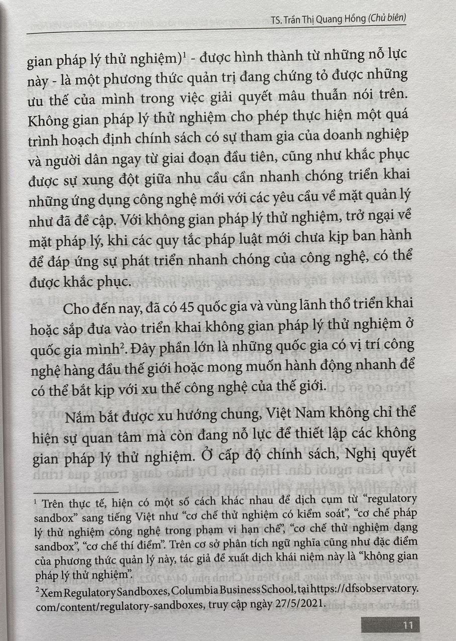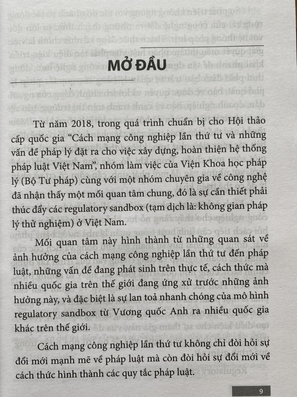 Từ những quan sát đó, nhóm làm việc của Viện Khoa học pháp lý và các chuyên gia từng cộng tác đã cùng nhau biên soạn cuốn sách: Phát triển không gian pháp lý thử nghiệm (Regulatory Sandbox) cho FinTech và các lĩnh vực công nghệ mới tại Việt Nam. Mục đích trước hết của cuốn sách này là cung cấp một nguồn tư liệu đáng tin cậy cho những người quản lý, các chuyên gia và công chúng về sự hình thành, phát triển, đặc điểm của các không gian pháp lý thử nghiệm, khả năng và những gợi ý cho việc thiết lập các không gian pháp lý thử nghiệm trong điều kiện ở Việt Nam. Mục đích này xuất phát từ mong muốn của chúng tôi là góp phần nhỏ bé của mình vào quá trình xây dựng, hoàn thiện pháp luật trong bối cảnh CMCN 4.0. Nhờ đó, Việt Nam có thể tận dụng được những sáng kiến về quản trị nhà nước đã được hình thành từ quá trình phát triển ở nhiều quốc gia trên thế giới như một cách để tận dụng được những thành tựu mới của cuộc cách mạng công nghệ.