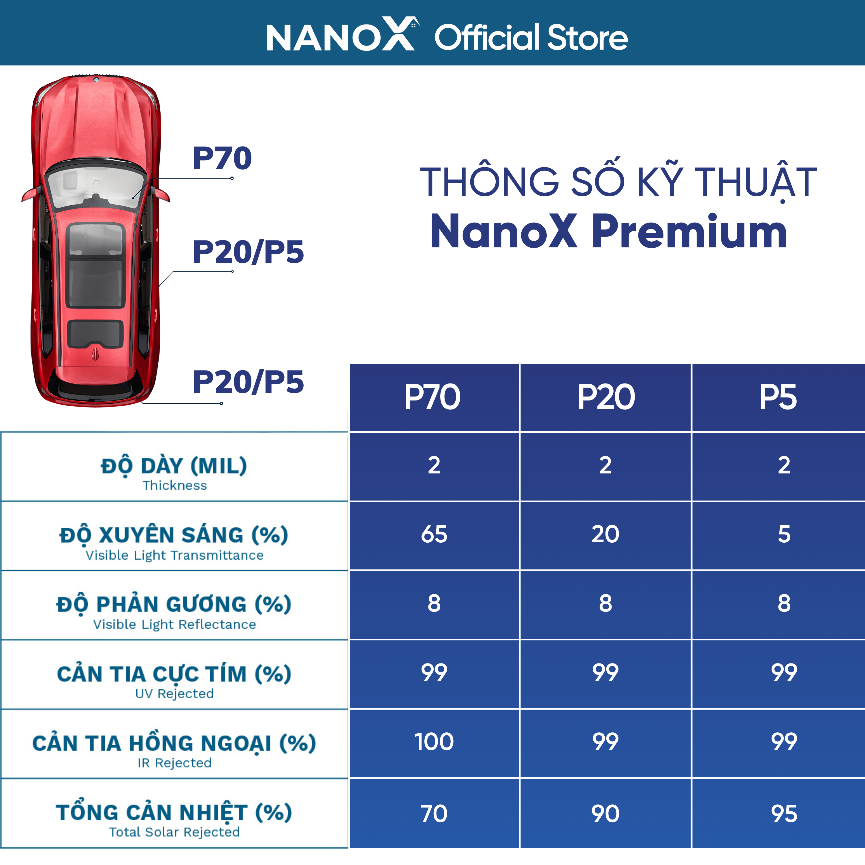 • NanoX Standard: Kính lái là công nghệ Nano Ceramic, kính sườn/hậu là công nghệ Dyed