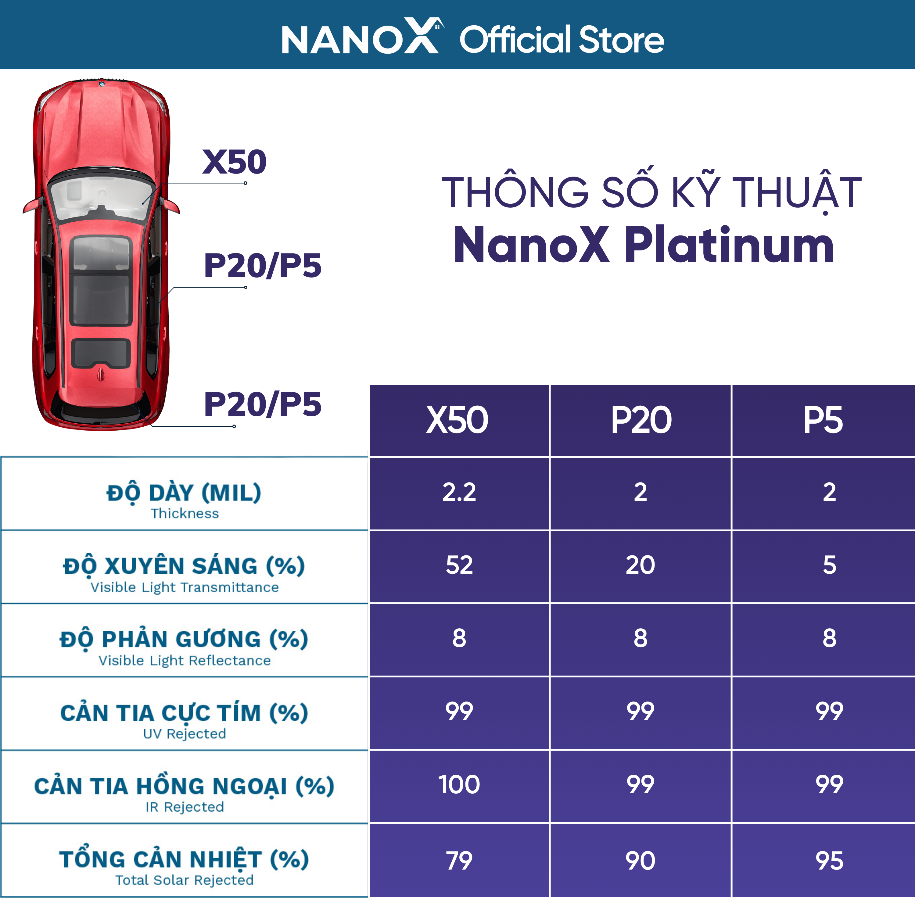 • NanoX Paltinum: Công nghệ Nano Ceramic cao cấp, Kính lái X50 cản nhiệt cao, trong suốt tối đa