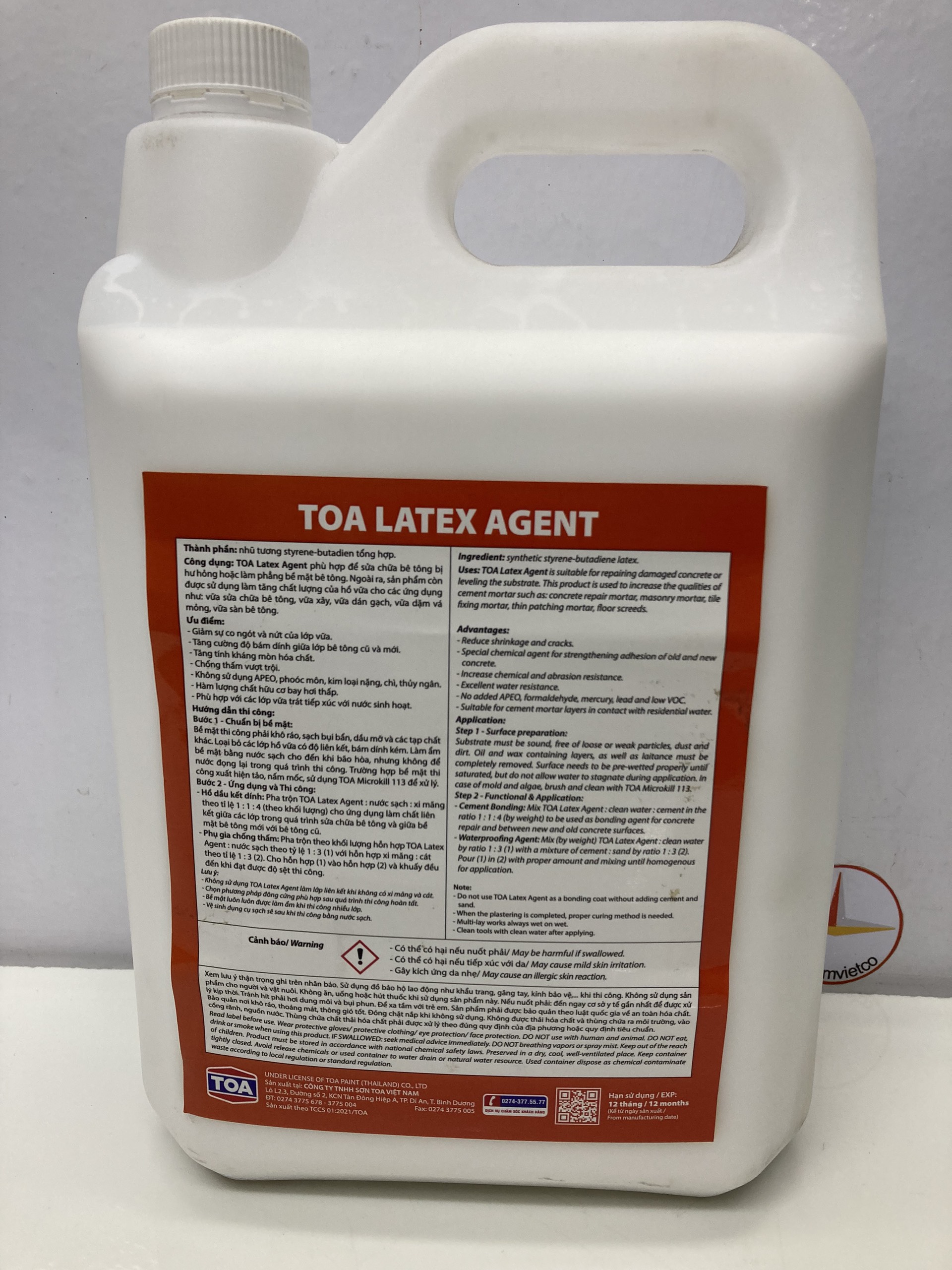 Phụ Gia Chống Thấm TOA Latex Agent_ 5L/can Thành phần: Nhũ tương Styrene-butadien tổng hợp. Toa Latex Agent dùng để sửa chữa bê tông bị hư hỏng hoặc làm phẳng bề mặt bê tông, giúp