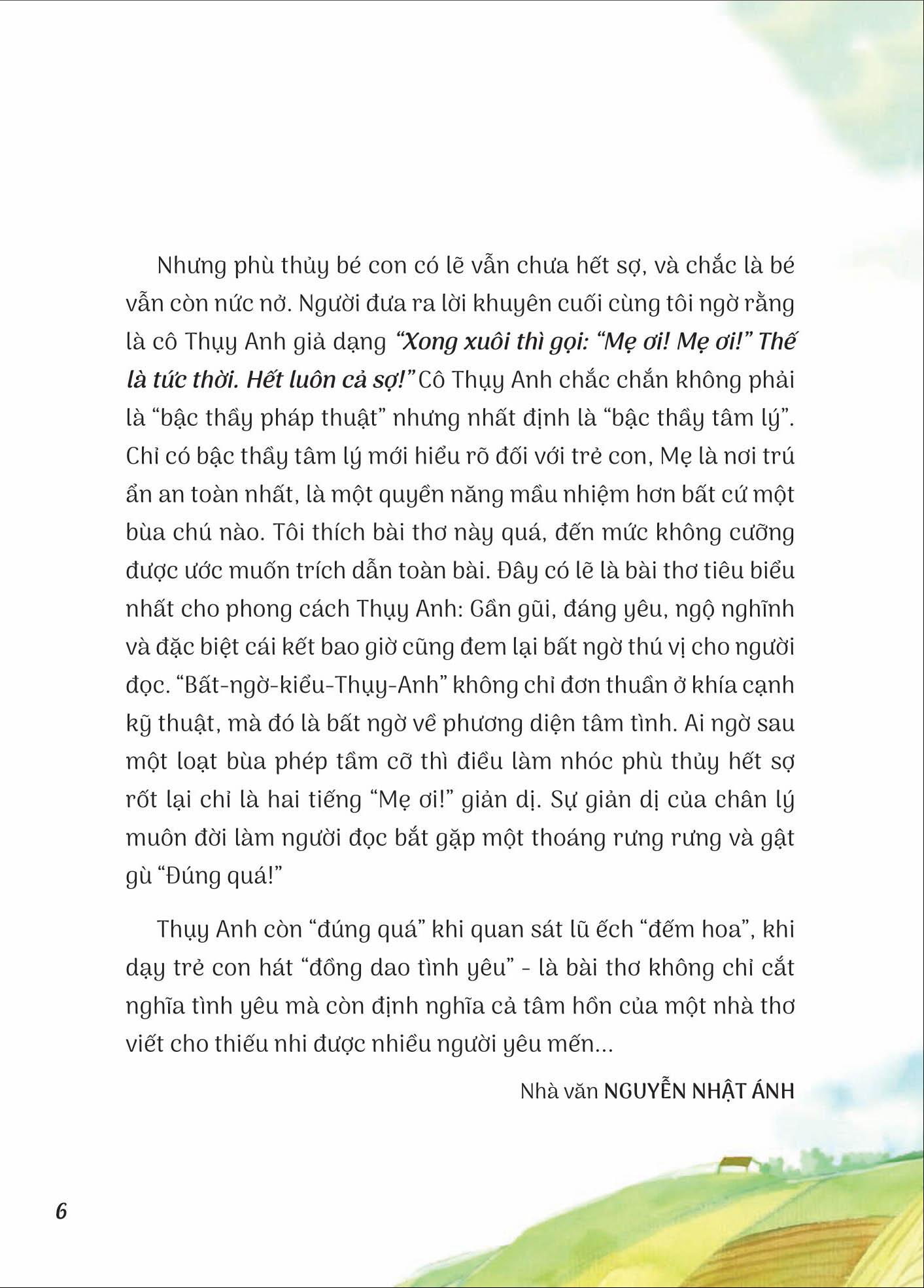 “Trẻ con nào mà chẳng sợ ma. Nhưng phù thủy mà sợ ma thì lạ quá. “Phù thủy sợ ma/Vừa đi vừa khóc!” Phù thủy có pháp thuật, có năng lực trấn áp tà ma, việc gì phải sợ nó? À, chắc đây là một bé phù thủy - đã là trẻ con thì mới “vừa đi vừa khóc”, và dù có là phù thủy vẫn sợ ma như thường… Cô Thụy Anh chắc chắn không phải là “bậc thầy pháp thuật” nhưng nhất định là “bậc thầy tâm lý”. Chỉ có bậc thầy tâm lý mới hiểu rõ đối với trẻ con… Đây có lẽ là bài thơ tiêu biểu nhất cho phong cách Thụy Anh: Gần gũi, đáng yêu, ngộ nghĩnh và đặc biệt cái kết bao giờ cũng đem lại bất ngờ thú vị cho người đọc. “Bất-ngờ-kiểu-Thụy-Anh” không chỉ đơn thuần ở khía cạnh kỹ thuật, mà đó là bất ngờ về phương diện tâm tình.” (Nhà văn Nguyễn Nhật Ánh)