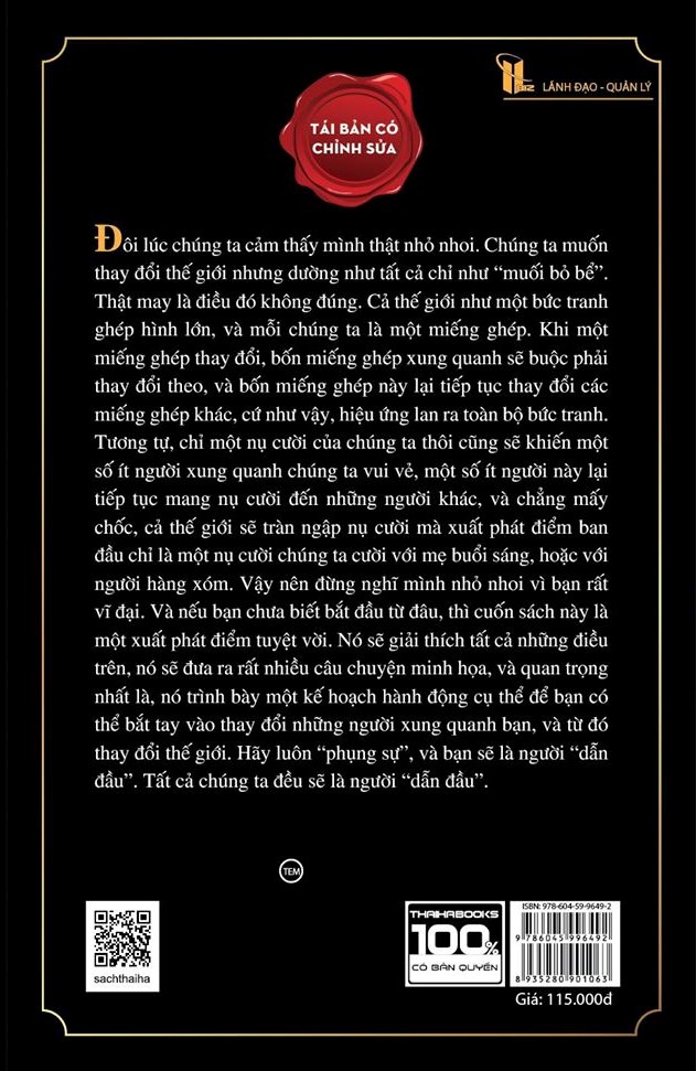Bạn đã hiểu rồi chứ? Vậy nên đừng nghĩ mình nhỏ nhoi vì bạn rất vĩ đại. Và nếu bạn chưa biết bắt đầu từ đâu, thì Phụng sự để dẫn đầu là một xuất phát điểm tuyệt vời. Phụng sự để dẫn đầu sẽ giải thích tất cả những điều trên, nó sẽ đưa ra rất nhiều câu chuyện minh họa, và quan trọng nhất là, nó trình bày một kế hoạch hành động cụ thể để bạn có thể bắt tay vào thay đổi những người xung quanh bạn, và từ đó thay đổi thế giới. Hãy luôn “phụng sự,” và bạn sẽ là người “dẫn đầu.” Tất cả chúng ta đều sẽ là người “dẫn đầu.”