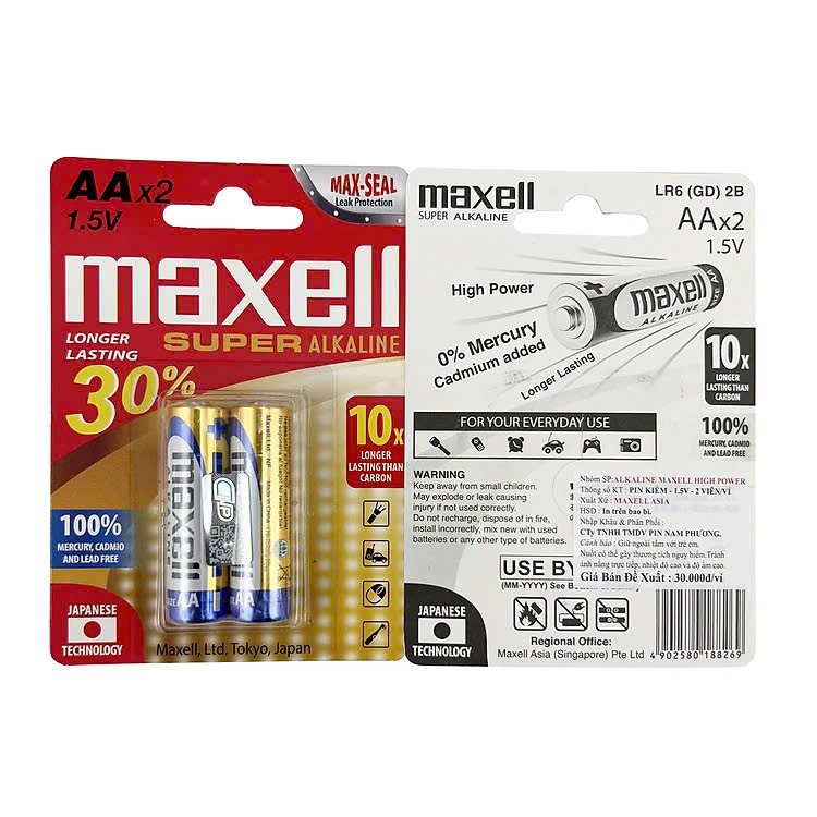 Thông số kỹ thuật – Pin Maxell Alkaline AA - Thương hiệu: Maxell (Nhật Bản) - Mã sản phẩm: LR6(GD)2B-Super - Điện áp: 1.5V - Dung lượng: khoảng 2000 mAh (theo công bố của hãng)