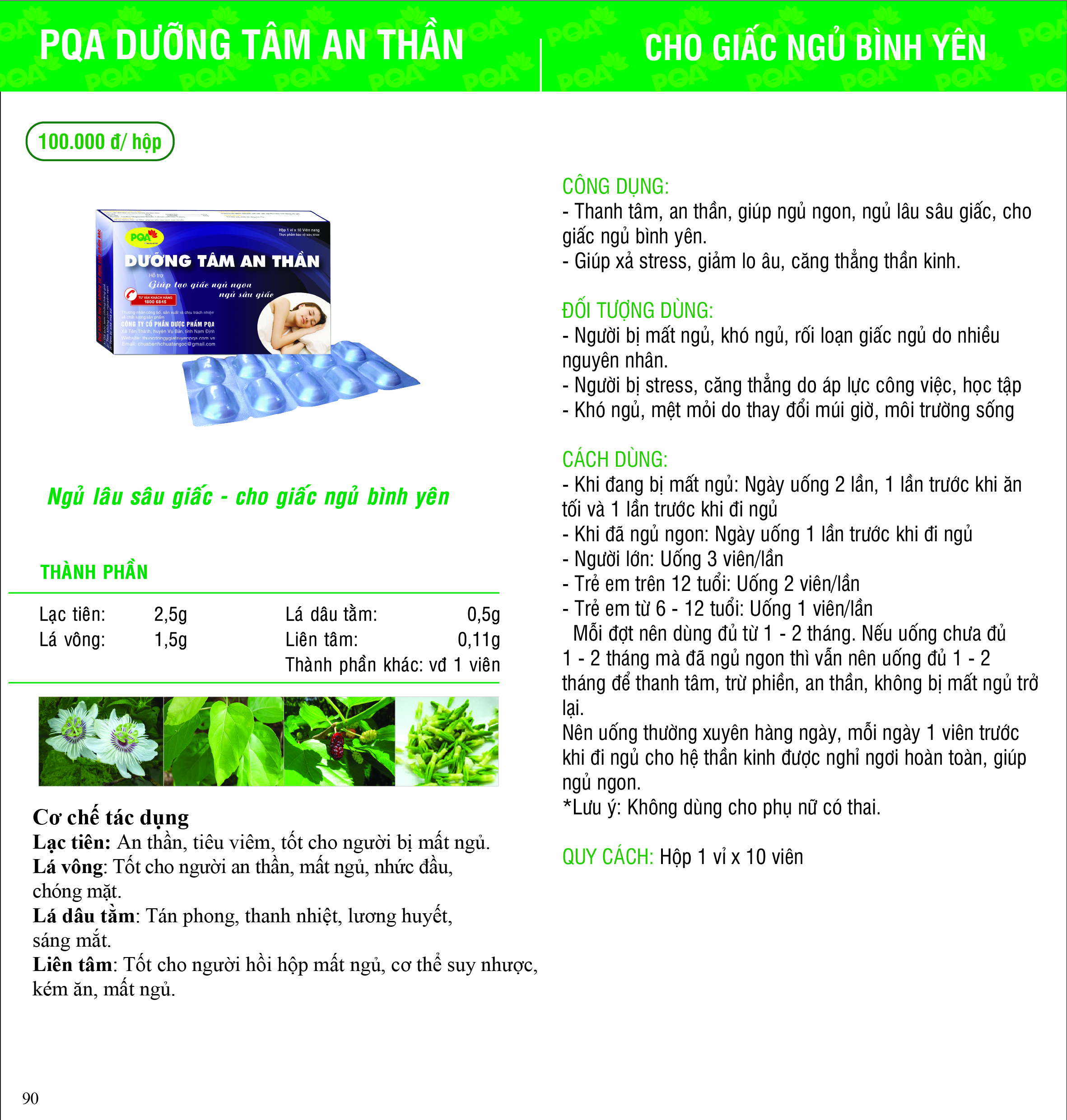 THÀNH PHẦN:Mỗi viên nang cứng 637 mg chứa: - Cao lỏng hỗn hợp 355 mg (tương đương + Lạc tiên 600 mg + Lá Vông nem 600 mg + Trinh nữ 600 mg + Lá
