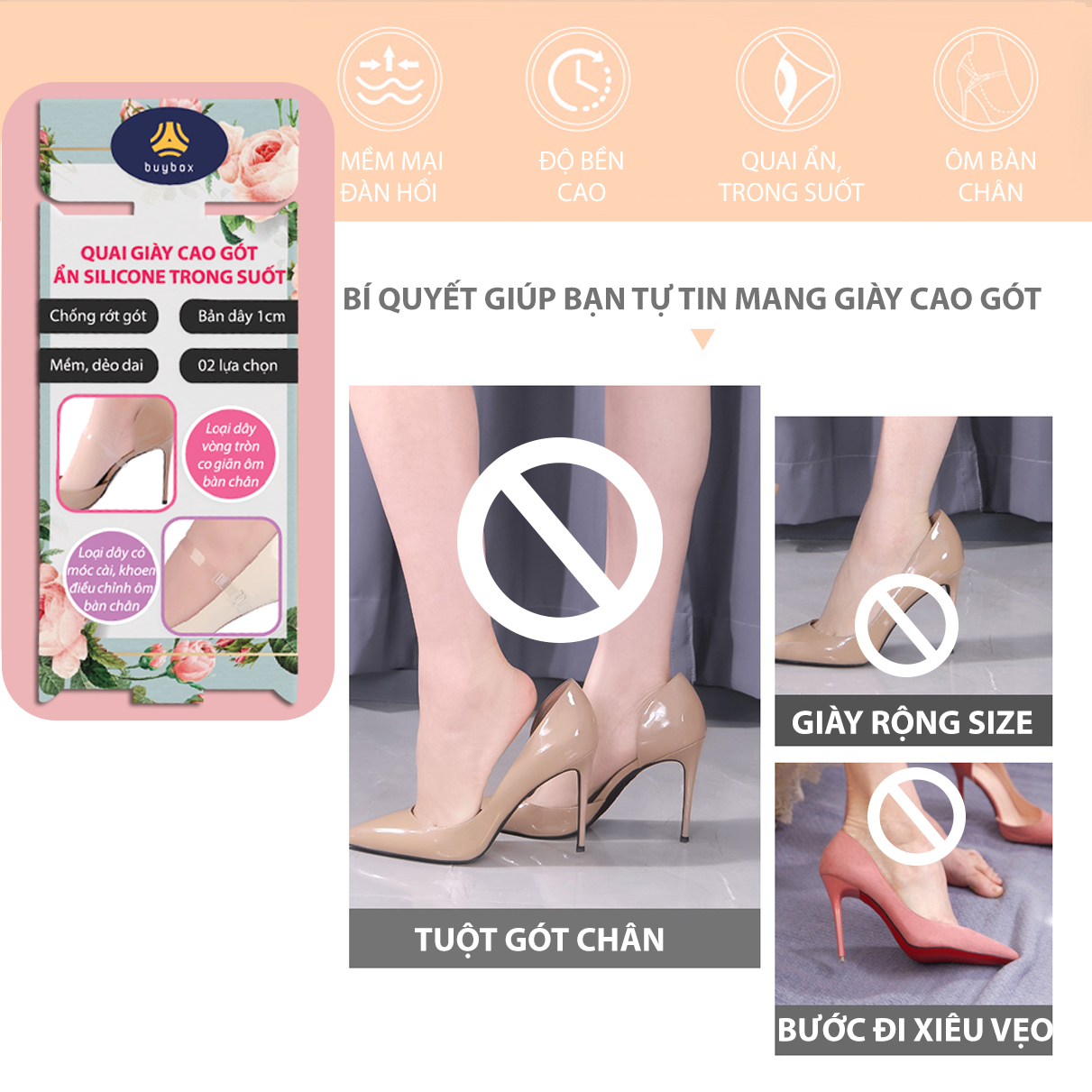 - Gót giày nhọn mảnh khảnh vừa bước chân đã trật ngay mắt cá chân Sử dụng quai giày ẩn trong suốt giúp giữ bàn chân ôm giày khắc phục được các vấn đề nêu trên để bạn tự tin sải bước! CÔNG DỤNG NỔI BẬT