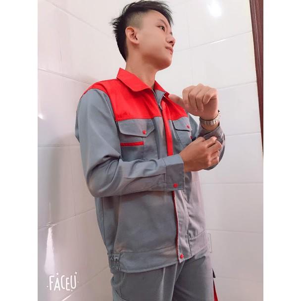 Mua tại TiktokTHÔNG TIN SẢN PHẨM SHUNI006B: Sản xuất tại: Việt Nam Màu: ghi xám phối đỏ Chất liệu: Chất liệu vải kaki dầy dặn 3.1 Bộ quần áo bảo hộ lao động bao gồm 1 áo dài tay và 1 quần dài: được phối màu rất khéo léo giữa hai gam màu: Màu đỏ và ghi xám