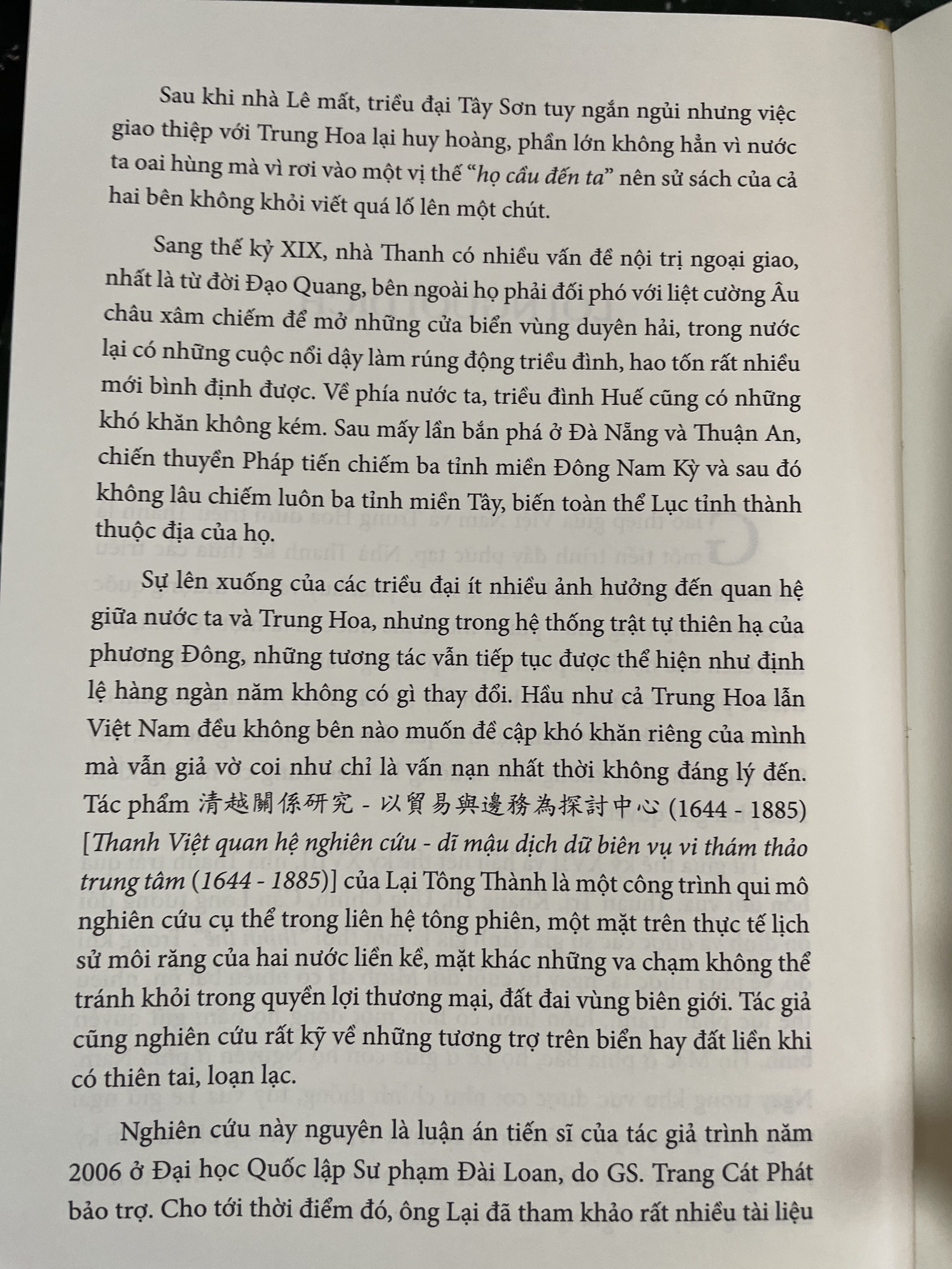 QUAN HỆ VIỆT NAM - TRUNG HOA DƯỚI TRIỀU THANH Tác giả: Lại Tông Thành Dịch và giới thiệu: Nguyễn Duy Chính Giao thiệp giữa Việt Nam và Trung Hoa dưới triều Thanh là một tiến trình đầy phức tạp. Nhà Thanh kế thừa các triều đại trước và tiếp tục chính sách ki mi để phát huy vai trò thượng quốc theo hệ thống tông chủ - phiên thuộc mà nước ta là một vệ tinh, nói theo cách của họ thì là phên giậu ở phương Nam, che chắn cho thiên triều ở phía Bắc. Trong hơn hai thế kỷ (1644 - 1911) Trung Hoa chỉ có một triều đại, thì Việt Nam lại trải qua đến ba bốn dòng họ (Lê, Tây Sơn, Nguyễn), lên xuống thất thường lúc nào cũng có những khúc mắc phải giải quyết. Từ giữa thế kỷ XVII và hầu hết thế kỷ XVIII, nhà Thanh trải qua bốn đời vua: Thuận Trị, Khang Hi, Ung Chính, Càn Long tương đối ổn định và được các sử gia đánh giá là một thời “thịnh thể”. Trong khi đó, về phía nước ta, ngay từ cuối đời Minh đã có nhiều bất ổn, nhiều thế lực phân tranh, luôn luôn có hơn một dòng họ nắm giữ quyền bính. Họ Mạc ở phía Bắc, họ Lê ở giữa còn họ Nguyễn ở phía Nam. Ngay trong khu vực được coi như chính thống, tuy vua Lê giữ ngai vàng nhưng thực quyền ở trong tay chúa Trịnh và trong nhiều thời kỳ, những đám giặc lớn nổi lên cát cứ một phương nên trên thực tế nước ta không mấy khi “giang sơn thu về một mối”. Sau khi nhà Lê mất, triều đại Tây Sơn tuy ngắn ngủi nhưng việc giao thiệp với Trung Hoa lại huy hoàng, phần lớn không hẳn vì nước ta oai hùng mà vì rơi vào một vị thế “họ cầu đến ta nên sử sách của cả hai bên không khỏi viết quá lố lên một chút. Sang thế kỷ XIX, nhà Thanh có nhiều vấn đề nội trị ngoại giao, nhất là từ đời Đạo Quang, bên ngoài họ phải đối phó với liệt cường Âu châu xâm chiếm để mở những cửa biển vùng duyên hải, trong nước lại có những cuộc nổi dậy làm rúng động triều đình, hao tốn rất nhiều mới bình định được. Về phía nước ta, triều đình Huế cũng có những khó khăn không kém. Sau mấy lần bắn phá ở Đà Nẵng và Thuận An, chiến thuyền Pháp tiến chiếm ba tỉnh miền Đông Nam Kỳ và sau đó không lâu chiếm luôn ba tỉnh miền Tây, biến toàn thể Lục tỉnh thành thuộc địa của họ. Sự lên xuống của các triều đại ít nhiều ảnh hưởng đến quan hệ giữa nước ta và Trung Hoa, nhưng trong hệ thống trật tự thiên hạ của phương Đông, những tương tác vẫn tiếp tục được thể hiện như định lệ hàng ngàn năm không có gì thay đổi. Hầu như cả Trung Hoa lẫn Việt Nam đều không bên nào muốn đề cập khó khăn riêng của mình mà vẫn giả vờ coi như chỉ là vấn nạn nhất thời không đáng lý đến. Tác phẩm (1644-1885) [Thanh Việt quan hệ nghiên cứu - dĩ mậu dịch dữ biên vụ vi thám thảo trung tâm (1644 - 1885)] của Lại Tông Thành là một công trình qui mô nghiên cứu cụ thể trong liên hệ tông phiên, một mặt trên thực tế lịch sử môi răng của hai nước liền kề, mặt khác những va chạm không thể tránh khỏi trong quyền lợi thương mại, đất đai vùng biên giới. Tác giả cũng nghiên cứu rất kỹ về những tương trợ trên biển hay đất liền khi có thiên tai, loạn lạc. Nghiên cứu này nguyên là luận án tiến sĩ của tác giả trình năm 2006 ở Đại học Quốc lập Sư phạm Đài Loan, do GS. Trang Cát Phát bảo trợ. Cho tới thời điểm đó, ông Lại đã tham khảo rất nhiều tài liệu trong văn khố của Đài Loan, nhiều tài liệu trước nay chưa hề được công bố. Những văn bản đó chủ yếu là tài liệu hành chánh, các tấu sớ, dụ chỉ của nhà Thanh, quốc thư của Việt Nam và nhiều bộ sử quan trọng của nước ta nguyên tác soạn bằng chữ Hán đã từng được ấn hành tại Nhật Bản, Hong Kong hay Đài Loan, Bắc Kinh... nên có thể sử dụng ngay các thư viện địa phương chứ không cần phải sang Việt Nam hay các quốc gia lân cận. Với qui mô gần như không sót một chủ đề lớn nào, Lại Tông Thành đã tìm hiểu kỹ càng thực tế chính trị, địa lý lẫn phạm trù triết học hình nhi thượng về quan niệm thiên nhân tương dữ để miêu tả đầy đủ qua lại giữa hai bên, nghĩa vụ và bổn phận trong liên hệ hai chiều nước lớn, nước nhỏ. Với nội dung trải dài như thế, nếu tách rời thì mỗi một chương đã có thể khai triển để thành một đề tài nên việc tập hợp vào chung một tác phẩm là điều rất khó khăn, việc trùng lặp không thể tránh khỏi nhất là vì tác giả cố gắng trích dẫn nguyên văn tài liệu, thay vì chỉ cần tóm tắt nội vụ để người đọc nắm được vấn đề. Nhiều văn bản đã dẫn thuật tại một mục này về sau lại được lặp lại ở một đề mục khác vì tuy cùng một tài liệu nhưng nội dung đề cập đến hai hay nhiều việc khác nhau. Việc đó cũng có thể hiểu được vì đây là một luận án tiến sĩ, hội đồng giám khảo thường đánh giá dựa trên công phu tìm kiếm văn bản gốc của nghiên cứu sinh nên cũng là một cách thể hi