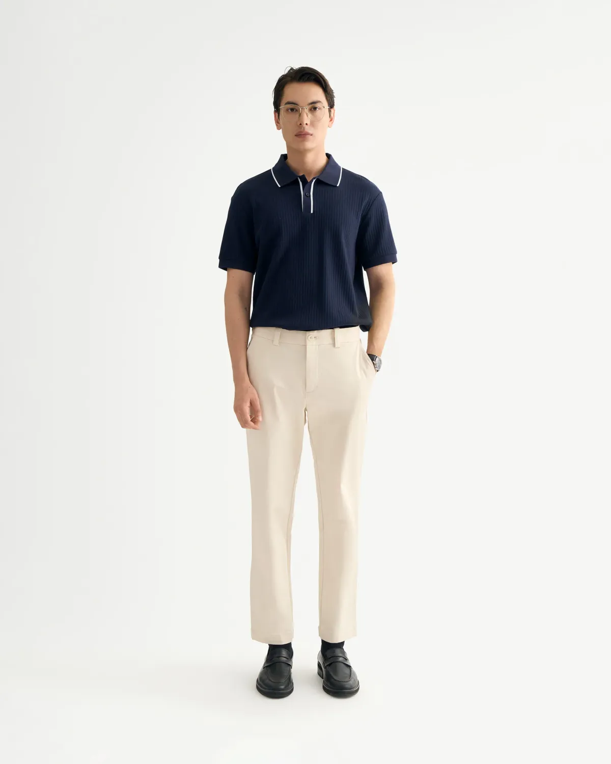 Quần kaki nam vải Dobby Form Slim Cropped - RT 10F24PCA039 | ROUTINE CÀ MAU Đặc điểm nổi bật Form : Slim cropped Fabric : Cotton Spandex Gender: Nam Collection: Holiday Sản phẩm này là