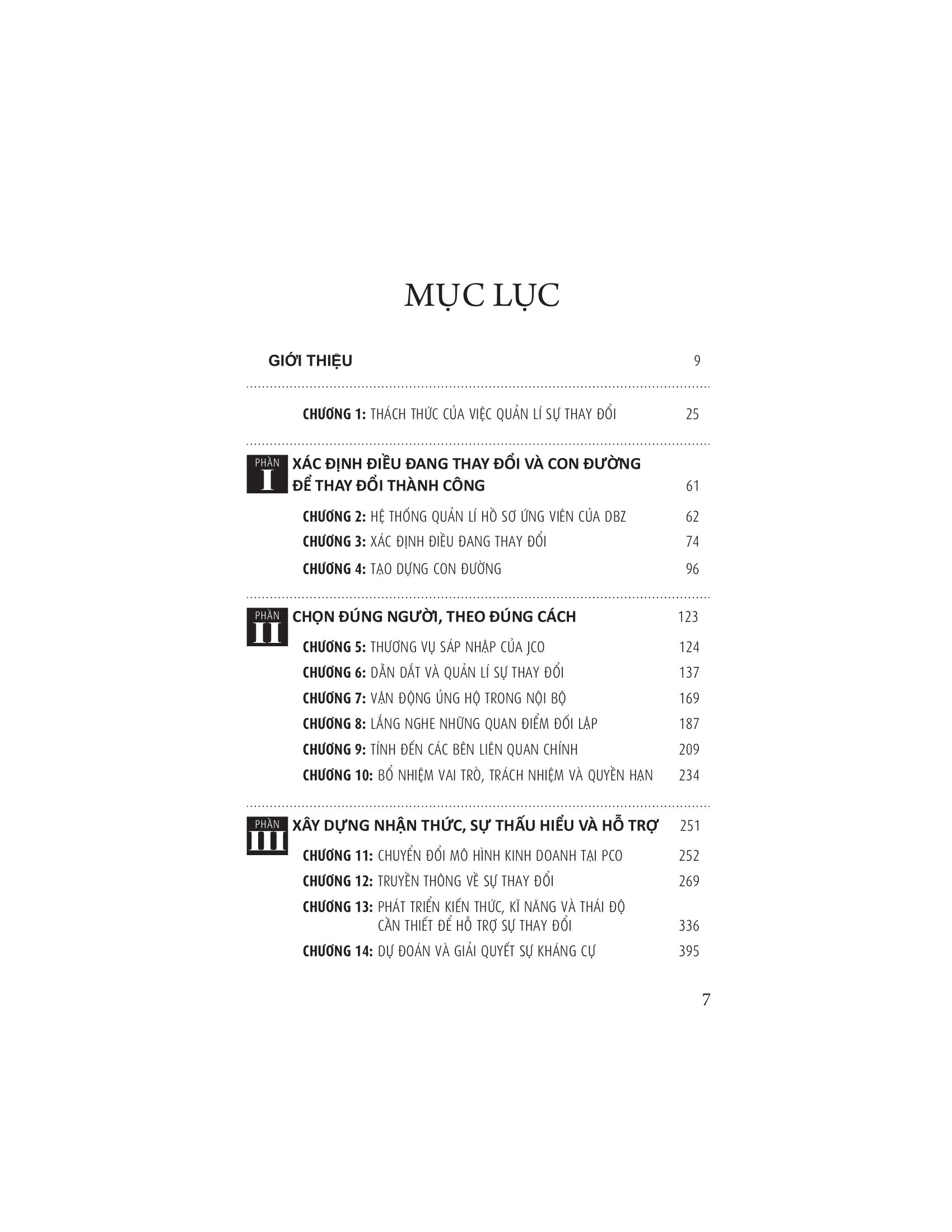 Cuốn sách đưa ra những phương pháp tiếp cận và công cụ để triển khai, tiếp nhận và quản lí sự thay đổi một cách hiệu quả. Cụ thể, tác giả chỉ ra rằng cần quản lí quy trình (mặt cứng) và con người (mặt mềm) của sự thay đổi và tìm ra điểm cân bằng tốt nhất giữa hai bên. Khi tích hợp cả hai, các tổ chức có thể quản lí sự thay đổi thành công và đạt được kết quả mong muốn. Đây chắc chắn là một cuốn cẩm nang hữu ích về điều hành, quản lí doanh nghiệp mà bất cứ doanh nhân nào cũng nên đọc một lần trong đời.