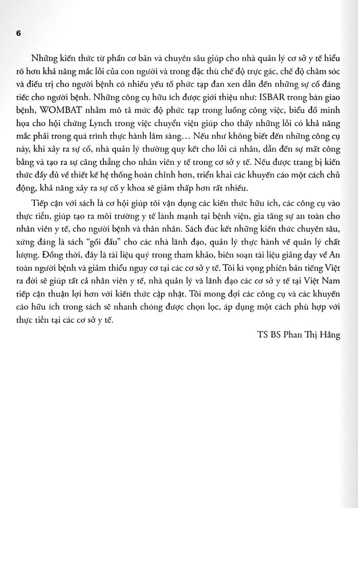 Cuốn sách cũng cung cấp đầy đủ lý thuyết và số liệu dịch tễ học tổng thể về an toàn người bệnh cũng nhưcho từng lĩnh vực để các nhà quản lý có thể tham khảo và lập kế hoạch cụ thể cho những hoạt động can thiệp có ý nghĩa ở cấp khoa, phòng, cấp cơ sở khám, chữa bệnh và cấp địa phương, cấp chuyên ngành và cấp quốc gia.