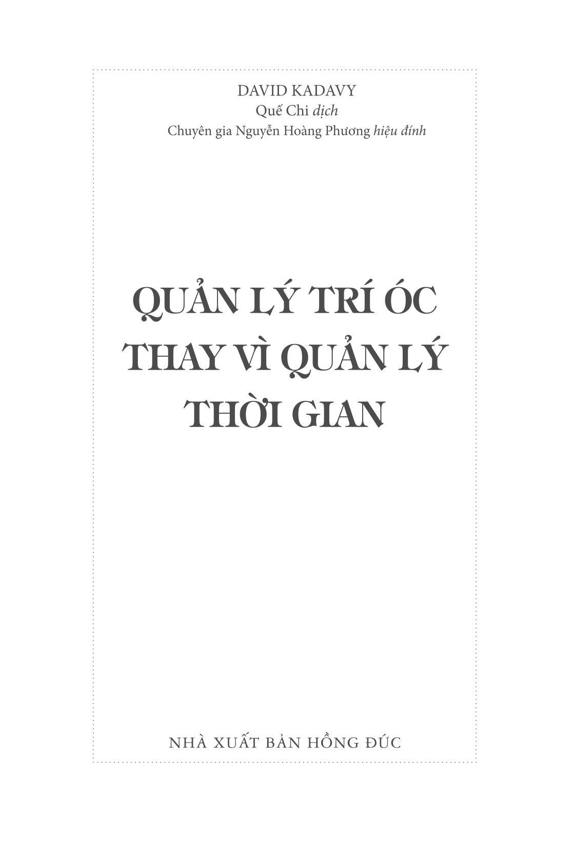 Muốn thoát được cạm bẫy của quản lý thời gian, sức mạnh tâm trí là thứ cần được ưu tiên bồi dưỡng. “Quản lý trí óc thay vì quản lý thời gian" chính là công cụ hữu hiệu giúp bạn tư duy vượt lên trên những lề thói và quy tắc thông thường, kích thích tiềm năng và tư duy sáng tạo đổi mới cho bản thân và đội nhóm vươn xa bao gồm 7 chương: