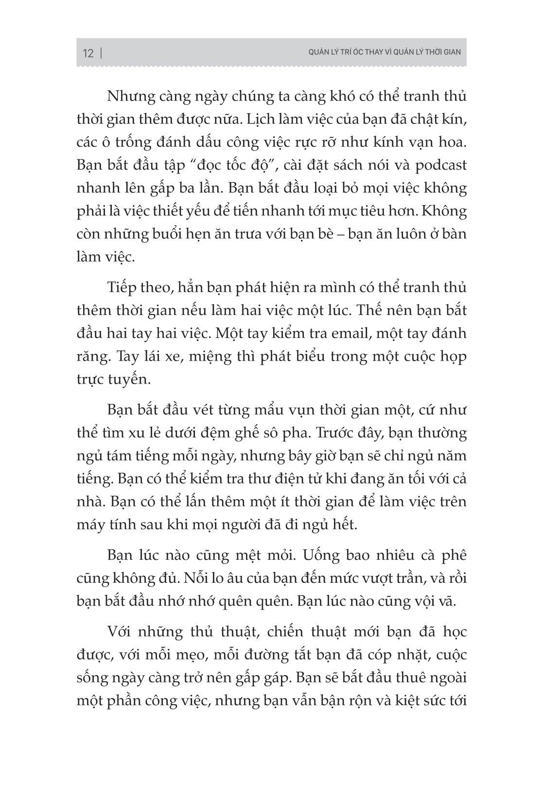 Nhiều khi chúng ta hành động cứ như thể không còn lựa chọn nào khác ngoài việc chèn thật chặt vào lịch làm việc, phải làm nhiều việc cùng lúc, và lúc nào cũng phải cập rập, vội vã. Bất cứ khi nào tìm được cơ hội để làm việc nhanh hơn, bớt phải chờ đợi hơn hoặc có thể “một mũi tên trúng hai đích" thì chúng ta cũng vồ lấy luôn. Chuyện này biến chúng ta thành những kẻ “sùng bái thời gian". Làm việc năng suất ngày nay không phải là chuyện quản lý thời gian, mà là quản lý tâm trí.