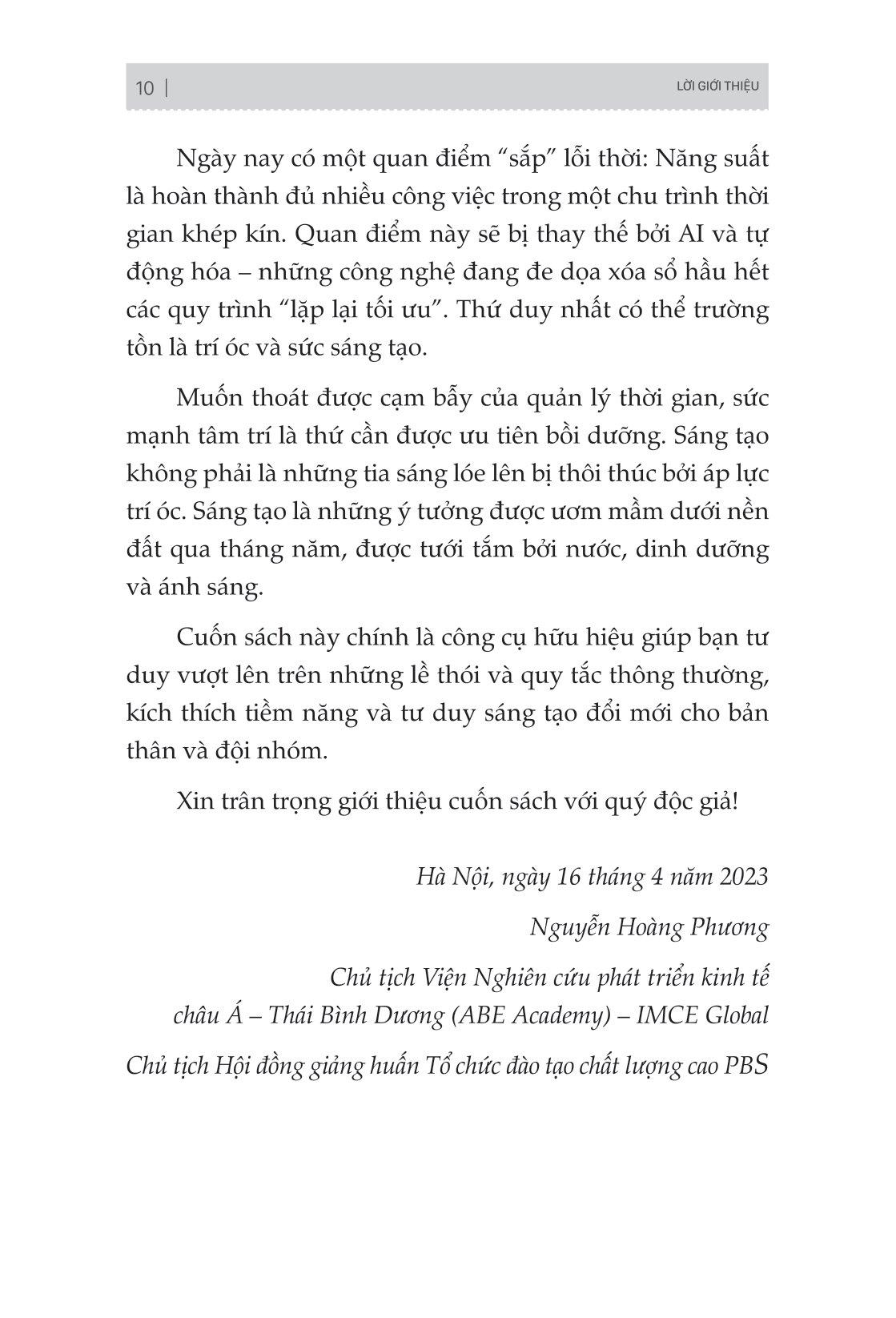 Để quản lý năng lượng sáng tạo của m.ình, hãy bắt đầu bằng việc tái tư duy về thời gian. Hãy tách m.ình ra mà quan sát thói quen sùng bái thời gian. Và “Quản lý trí óc thay vì quản lý thời gian" sẽ giúp bạn làm việc theo thời gian sự kiện và bạn chỉ làm theo thời gian đồng hồ chỉ khi nào thời gian đồng hồ là yếu tố thực sự quan trọng. Đừng cố gắng vơ víu một lượng kết quả nào đó trong những đơn vị thời gian. Thay vào đó, hãy sử dụng các đơn vị thời gian như những cột mốc chỉ đường mơ hồ để bố trí năng lượng của bạn vào những hoạt động đưa bạn đến tiến tới mục tiêu. Đừng quên, bạn không thể xây dựng được những hệ thống đòi hỏi mọi thứ phải hoàn hảo, vì hỗn loạn chính là hằng số duy nhất của đời sống. Hy vọng rằng cuốn sách sẽ là cẩm nang bất bại giúp tối đa hóa hiệu suất công việc, để bạn bứt phá, thăng hạng cả trong sự nghiệp lẫn cuộc sống.