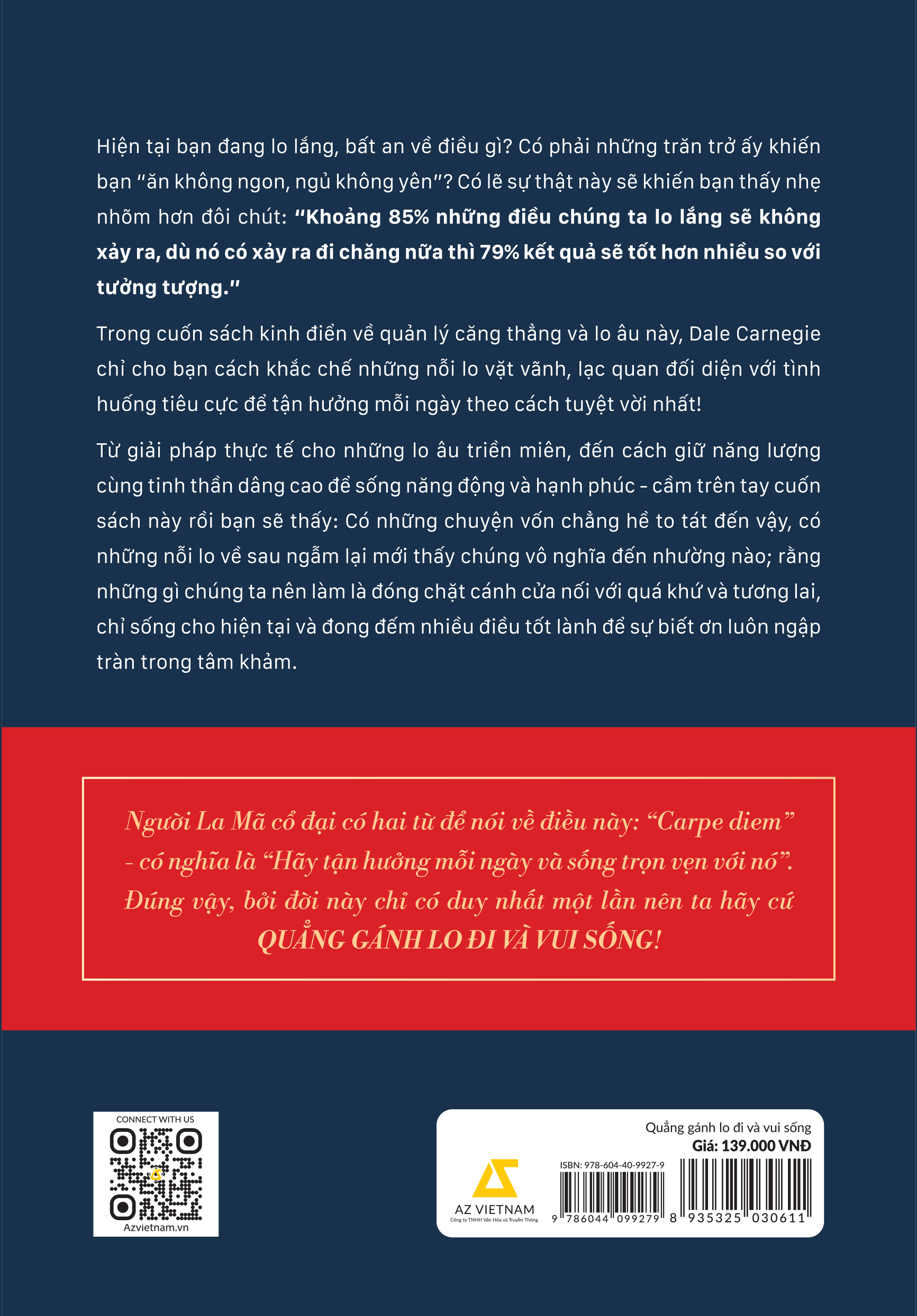 “Chúng ta bước vào tuổi trưởng thành mà hầu như chẳng được chuẩn bị chút gì để đối phó với những áp lực của cuộc sống, có khác gì một con mọt sách bị bắt đi múa ba-lê đâu. Và kết quả là… hơn phân nửa số giường bệnh bị lấp đầy bởi những con người hay lo âu và gặp vấn đề về cảm xúc.” Đó là thực trạng đáng báo động ở thế kỷ trước. Vậy tình hình có khả quan hơn vào ngày nay? Nếu xem tin tức, hẳn bạn đã có cho mình câu trả lời. Chiến tranh, dịch bệnh, khủng hoảng kinh tế, áp lực học hành, căng thẳng trong công việc, gia đình… Lo lắng không phân biệt thời gian hay đối tượng. Những thứ thuộc về bản chất con người thì khó lòng nào đổi thay. Bởi vậy, những nguyên tắc quản lý lo âu của DALE CARNEGIE trong cuốn QUẲNG GÁNH LO ĐI VÀ VUI SỐNG vẫn chạm đến nhu cầu của mọi người ở bất kể quốc gia, dù là năm 1948 hay 100 năm về sau nữa. Dale Carnegie không viết sách như một vị giáo sư đứng trên bục giảng, ông chỉ chân thành chia sẻ như một người bạn từng trải, kể về những câu chuyện “người thật việc thật” để từ đó, rút ra “bộ quy tắc vàng” về cách tìm lại bình yên trong tâm hồn có thể được áp dụng chung cho mọi thế hệ. Qua cuốn cẩm nang kinh điển về nghệ thuật sống này, bạn sẽ biết cách đặt giới hạn cho những nỗi lo thông thường, bình tĩnh đối diện và xử lý tình huống tiêu cực khi nó bất ngờ “đánh úp”, điều hướng tâm trí mình đến những điều tốt đẹp xung quanh để thực sự TẬN HƯỞNG MỖI NGÀY THEO CÁCH TUYỆT VỜI NHẤT! Từ giải pháp thực tế cho những lo âu triền miên, đến cách giữ năng lượng cùng tinh thần dâng cao để sống năng động và hạnh phúc - cầm cuốn sách này trên tay rồi bạn sẽ thấy: Có những chuyện vốn chẳng hề to tát đến vậy, có những nỗi lo về sau ngẫm lại mới thấy chúng vô nghĩa đến nhường nào, bởi “Khoảng 85% những điều chúng ta lo lắng sẽ không bao giờ xảy ra, kể cả có đi chăng nữa thì 79% kết quả vẫn là tốt hơn nhiều so với tưởng tượng.” Vậy điều tốt nhất chúng ta nên làm là gì? Hãy đọc sách và tìm cho mình câu trả lời phù hợp nhất, có lẽ, chính bạn cũng sẽ phải ngạc nhiên trước sự thật đơn giản mà sâu sắc trong những điều “không mới” ấy. “You only live once” - “Bạn chỉ sống một lần trong đời” thôi ư? Không, bạn sống MỖI NGÀY trong đời, và người La Mã cổ đại có hai từ để nói về điều này: “Carpe diem”, có nghĩa là “Hãy tận hưởng mỗi ngày và sống trọn vẹn với nó”. “Nếu ta sống trọn vẹn hôm nay thì hôm qua sẽ như một giấc mơ đầy hạnh phúc, Và ngày mai sẽ mở ra hy vọng ngập tràn. Vậy nên hãy sống hết mình với hôm nay!” Bookland chúc bạn từ ngày đọc cuốn sách này sẽ thực sự quẳng được gánh lo và vui sống theo cách riêng của mình! Trong phiên bản mới do thương hiệu Bookland phát hành, chúng tôi cô đọng dung lượng so với bản gốc trên tinh thần bảo toàn nguyên vẹn những giá trị tinh túy nhất. Với mục tiêu tiếp cận đa dạng đối tượng độc giả, nhất là thế hệ trẻ có niềm quan tâm hứng thú với dòng sách kỹ năng kinh điển, Bookland trân trọng giới thiệu tới các bạn một bản dịch mới - thuần Việt và hiện đại hơn, bằng lối chuyển ngữ toát lên đồng thời cái hay cái đẹp của tiếng Việt cũng như chất riêng trong ngôn từ của “bậc thầy giao tiếp” DALE CARNEGIE. Trong thời đại số hóa nơi văn hóa đọc cần được thúc đẩy hơn như hiện nay, chúng tôi chân thành hy vọng phiên bản mới của tựa sách bất hủ này sẽ tới được tay càng nhiều người càng tốt!