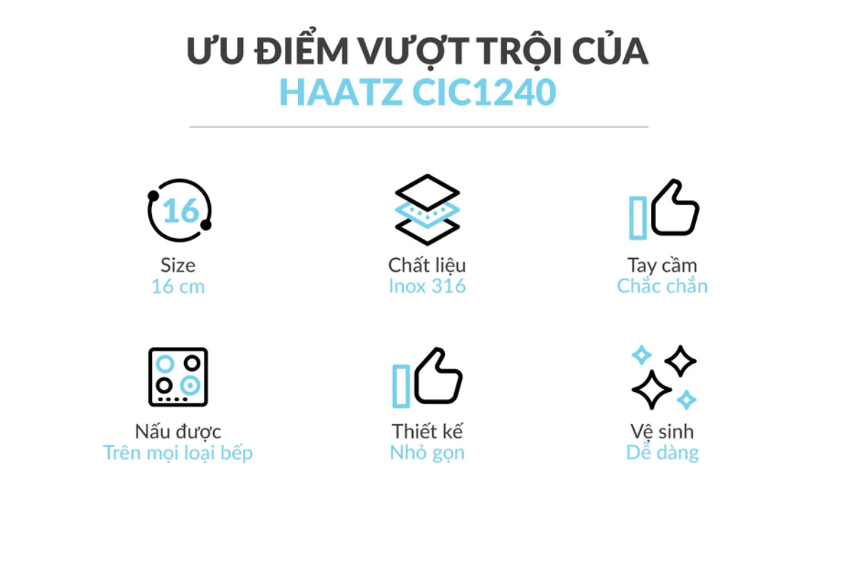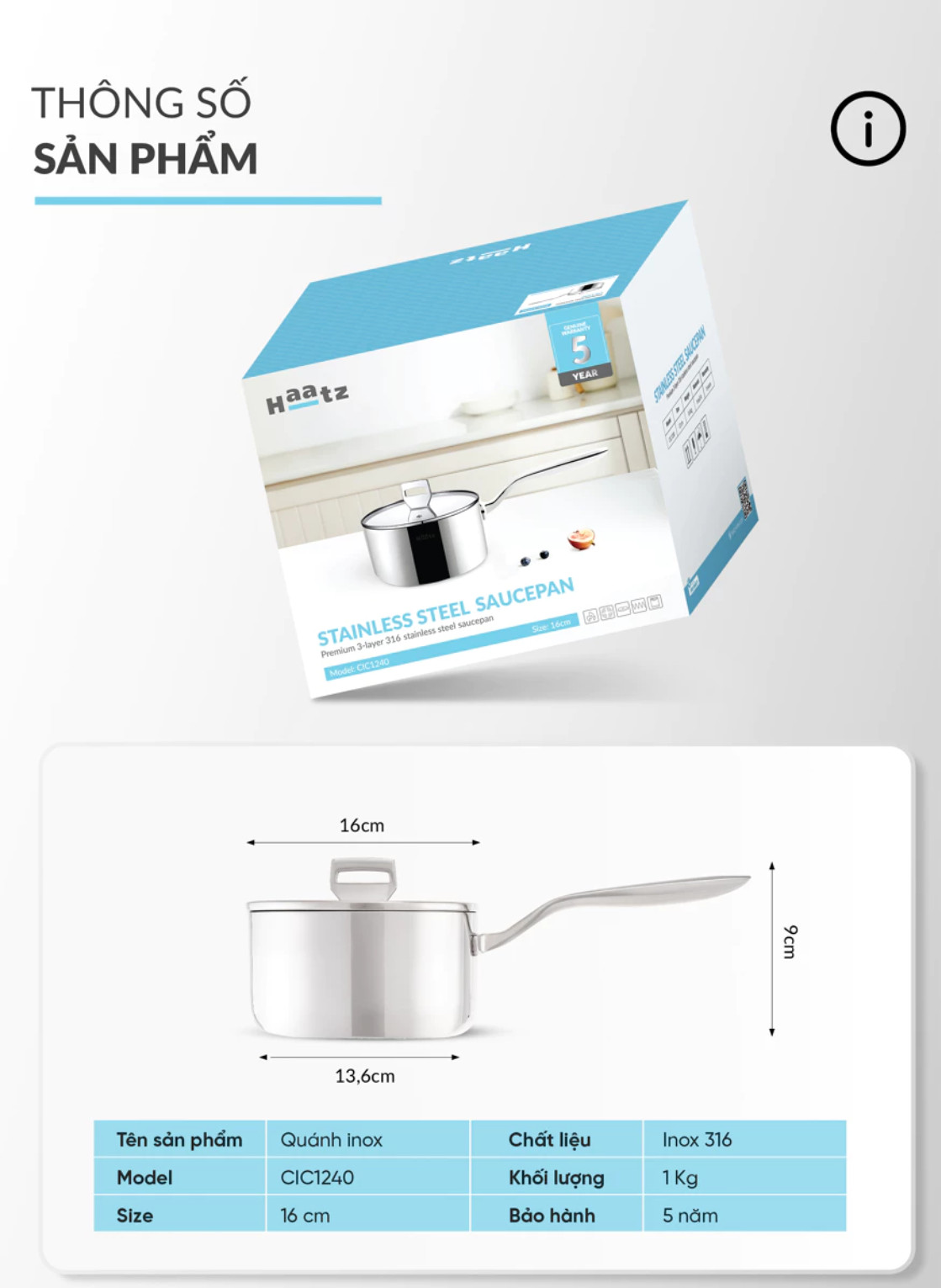 ✨Quánh Inox316 Đúc Đáy Liền 3 Lớp Haatz CIC1240 Size 16cm - Hàng Chính Hãng Bảo Hành 5 Năm