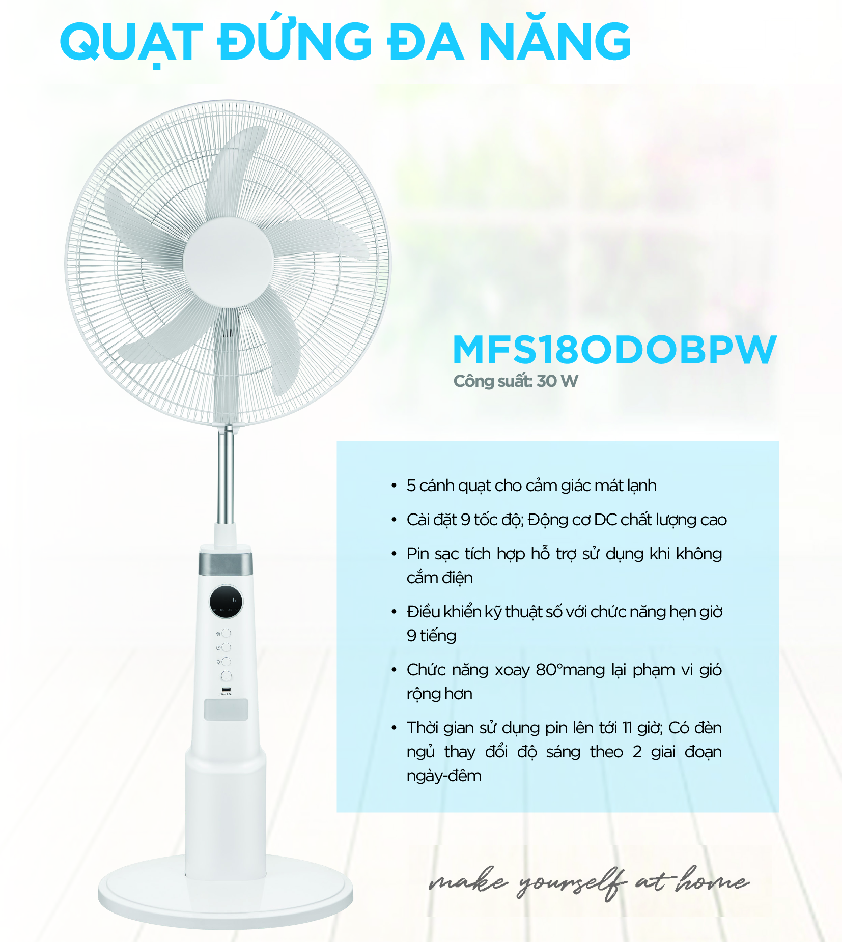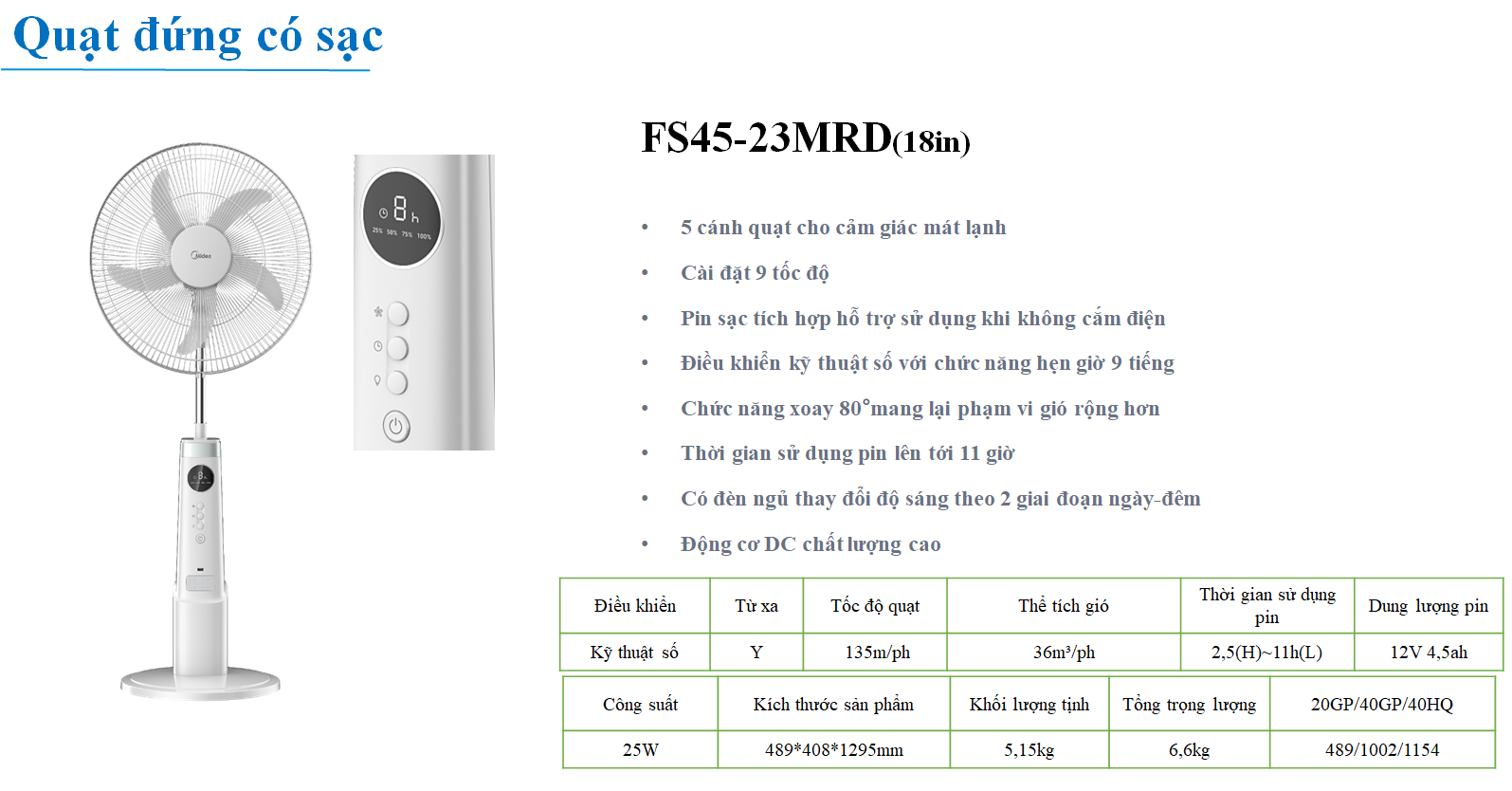 ✨Quạt Cây Đa Năng Midea MFS18ODOBPW / FS45-23MRD (Quạt Sạc Hàng Chính Hãng, Động Cơ DC inverter 30w)