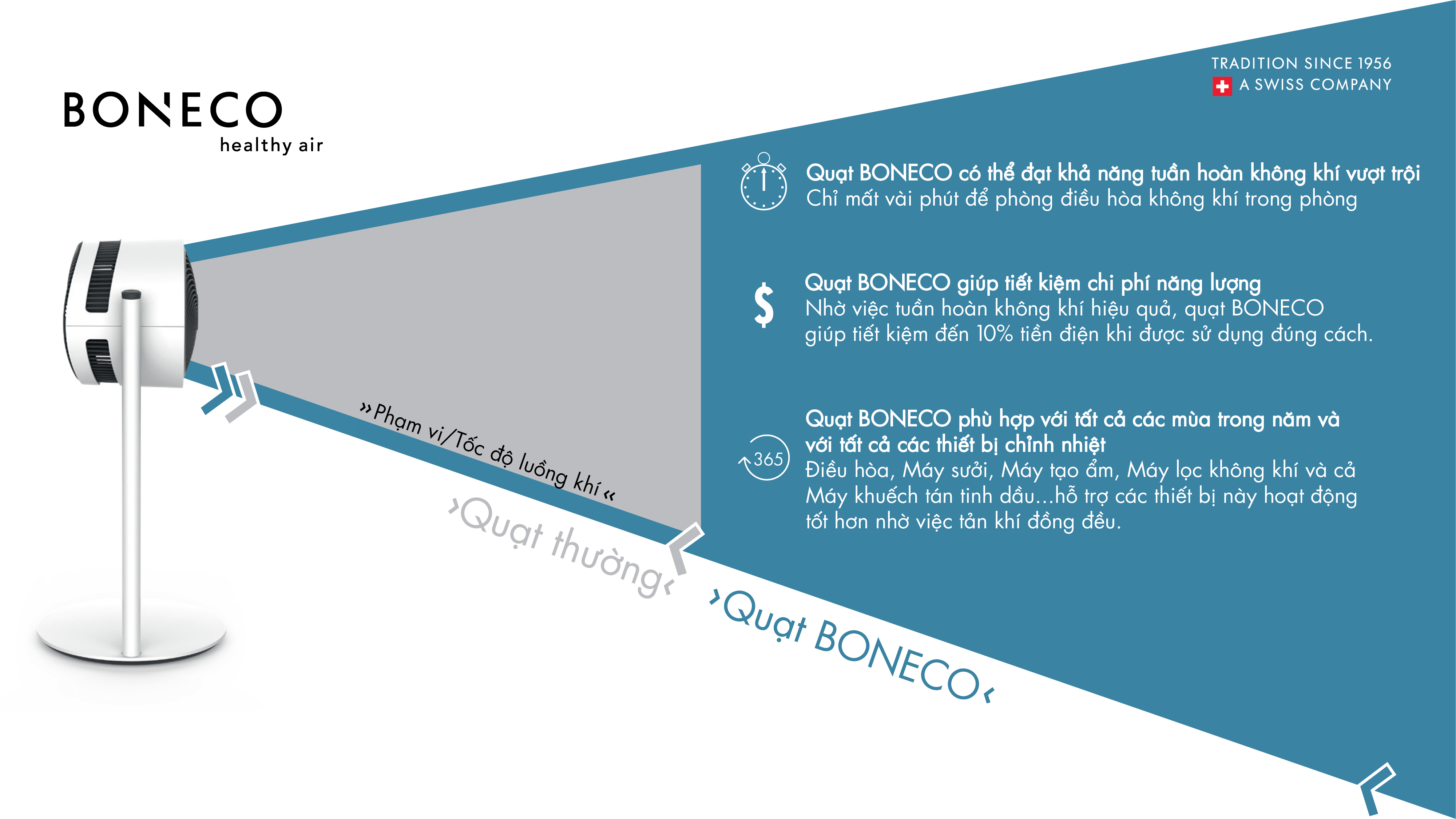 Boneco F230 với hệ thống làm mát đối lưu như với cơ chế hoạt động điều hoà không khí trong không gian phòng kín có sử dụng điều hoà, quạt điều hoà để cho không khí mát có thể khuếch tán rộng khắp mọi ngóc ngách trong phòng thay vì không khí mát chỉ tập trung vào một điểm.