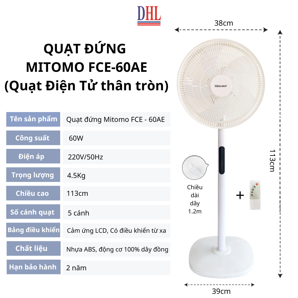 - Bảo hành 2 năm toàn quốc. Thông số kỹ thuật quạt đứng Mitomo FCE-60AE ( Quạt điện tử: phím cảm ứng, có điều khiển, có hẹn giờ )