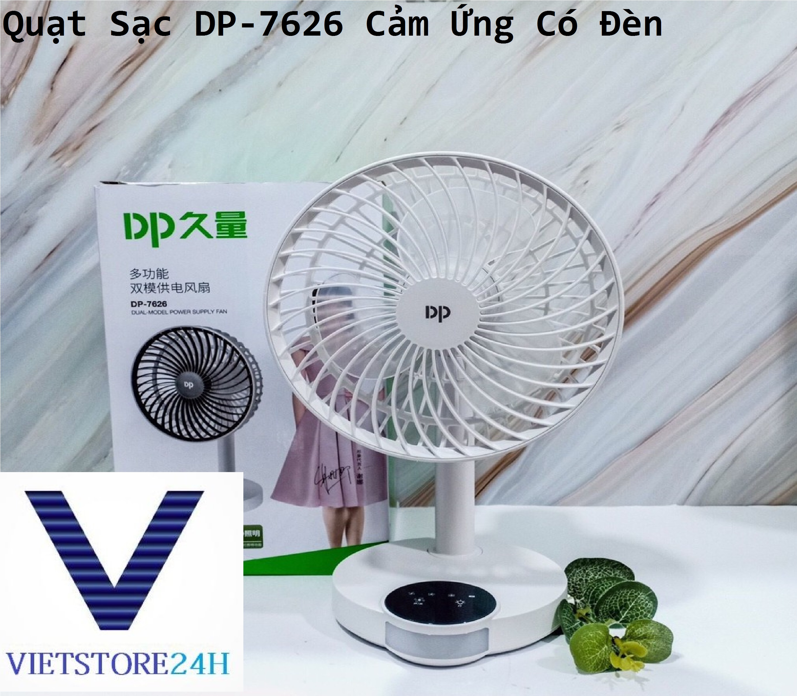 Quạt Sạc DP-7626 Cảm Ứng Có Đèn #Thông tin sản phẩm: - Mã sản phẩm : DP-7626 - Chất liệu : Nhựa ABS - Màu sắc : TRẮNG - Kích thước hộp: 30 x 18