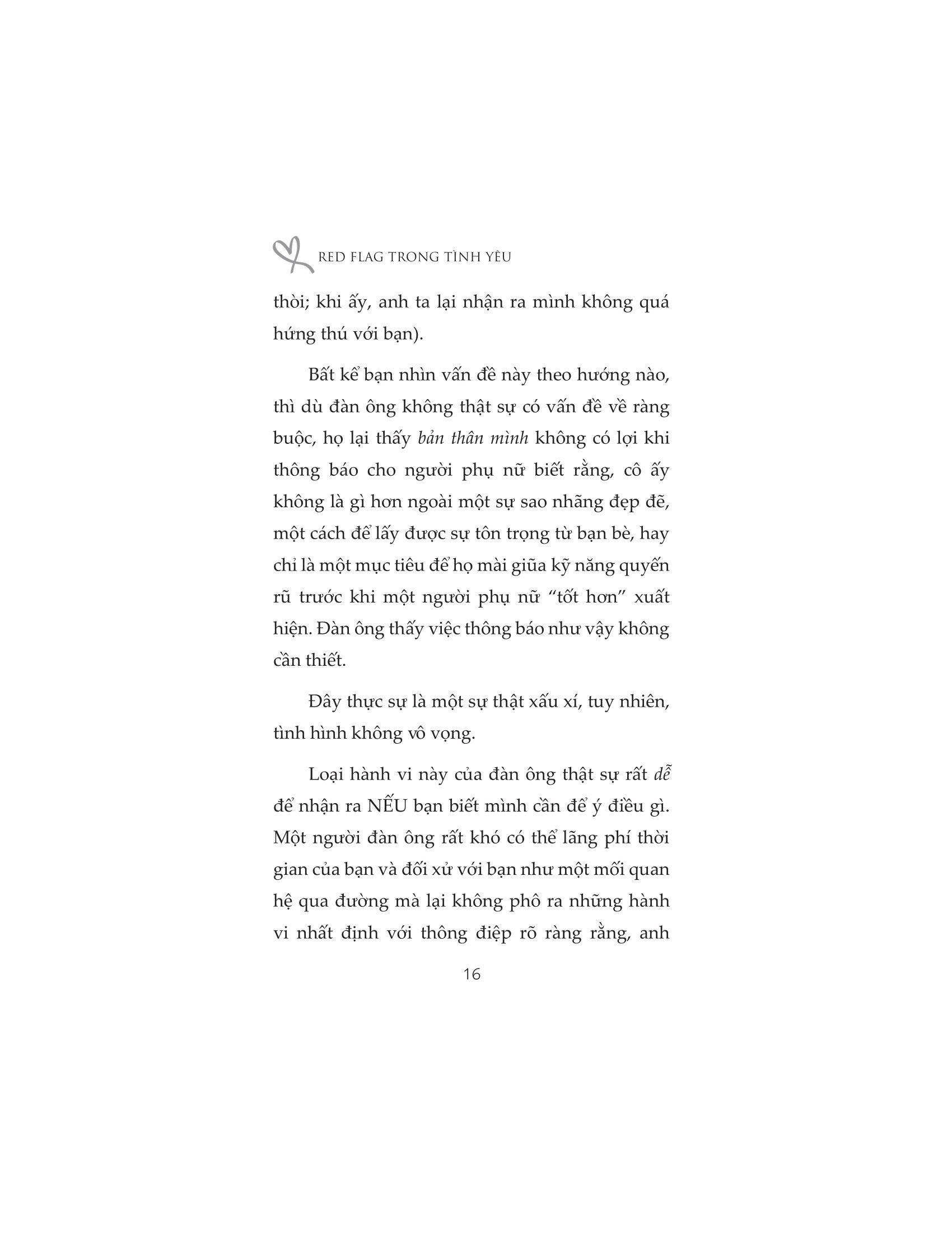 Red Flag Trong Tình Yêu Đàn ông không thật sự “sợ ràng buộc”. Khi một người đàn ông nói với bạn rằng anh ấy “sợ ràng buộc”, rất có thể điều anh ta thực sự muốn nói là anh ta không quan tâm đến bạn và chỉ lợi dụng bạn để giết thời gian cho đến khi gặp được ai đó “tốt hơn”. Phụ nữ thường thắc mắc tại sao đàn ông lại “biến mất” mà không có bất kỳ lời cảnh báo nào. Mặc dù có rất nhiều lý do khiến một người đàn ông rời xa bạn, nhưng lý do phổ biến nhất khiến anh ấy mất hứng thú là: Ngay từ đầu, anh ta đã chẳng mấy quan tâm đến bạn. Và cuốn sách “Red Flag trong tình yêu” sẽ giúp bạn sẽ có cái nhìn sâu sắc hơn về cách một người đàn ông suy nghĩ và tương tác với một người phụ nữ khi anh ta không thực sự quan tâm đến cô ấy. Vớicuốn sách này, bạn sẽ biết được: