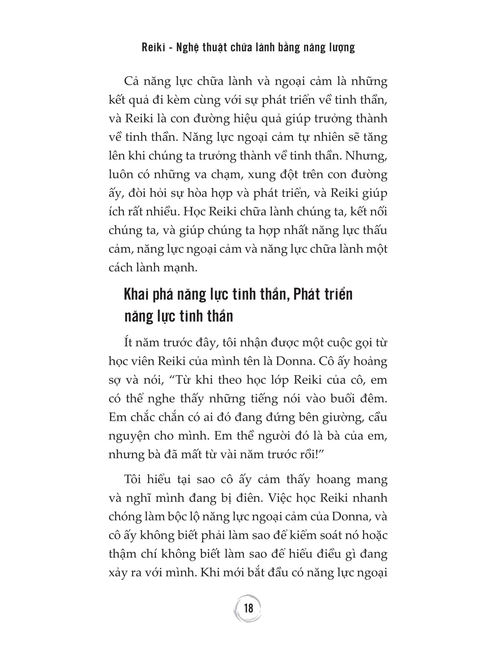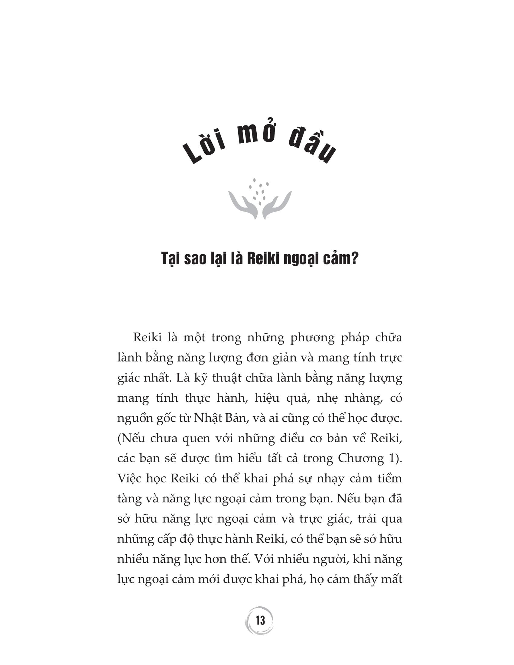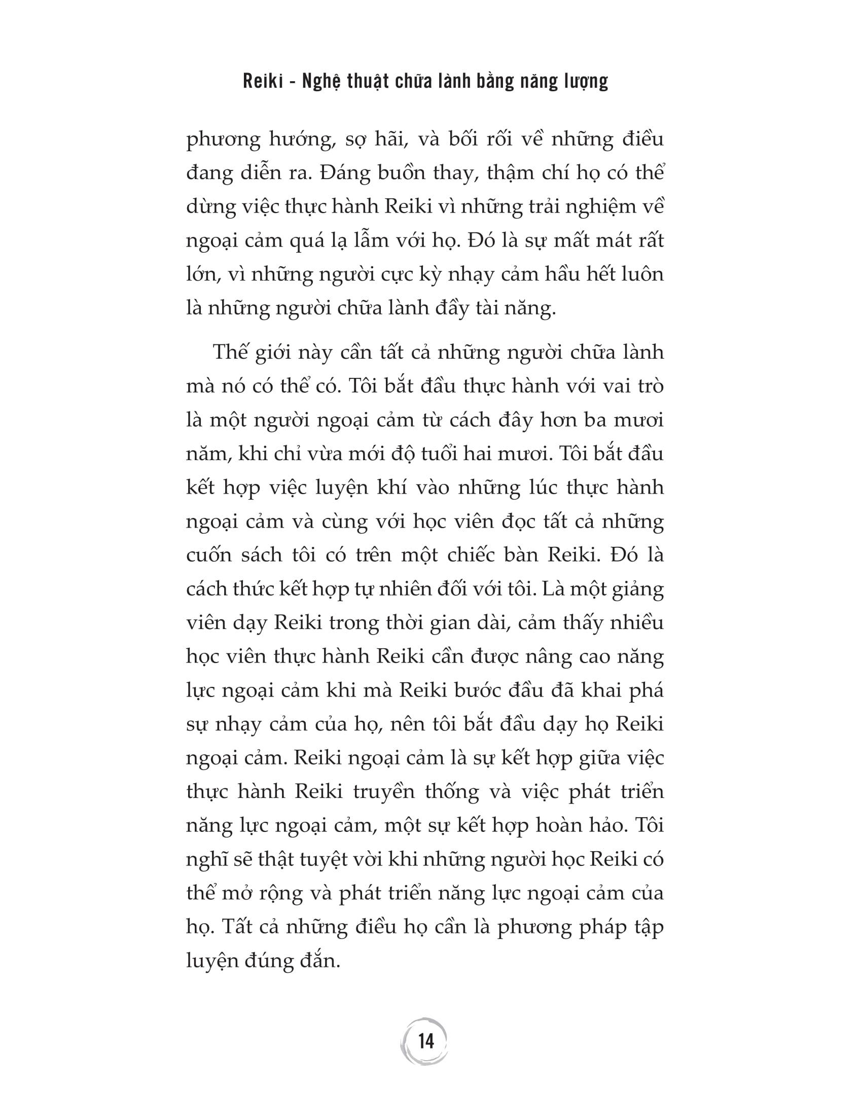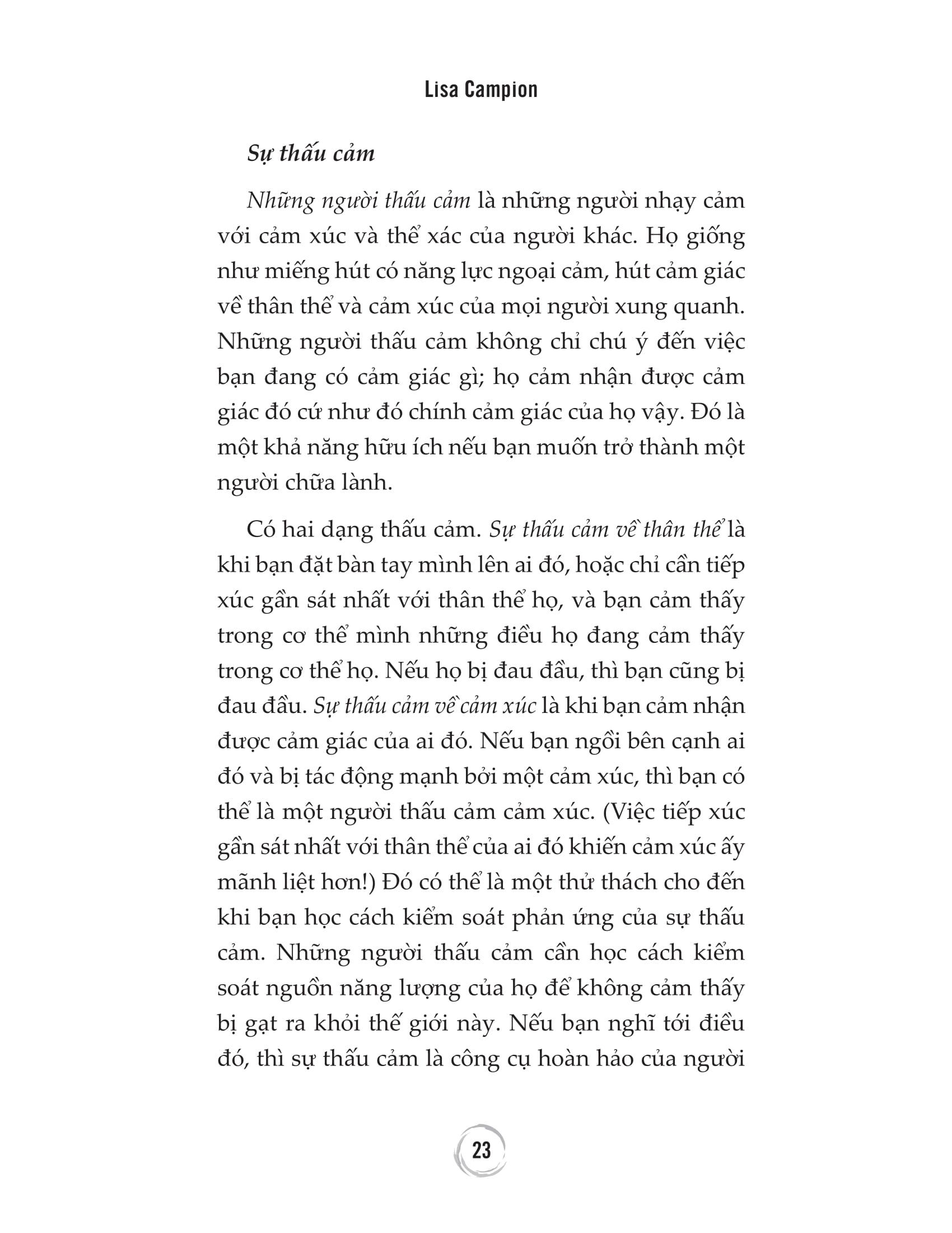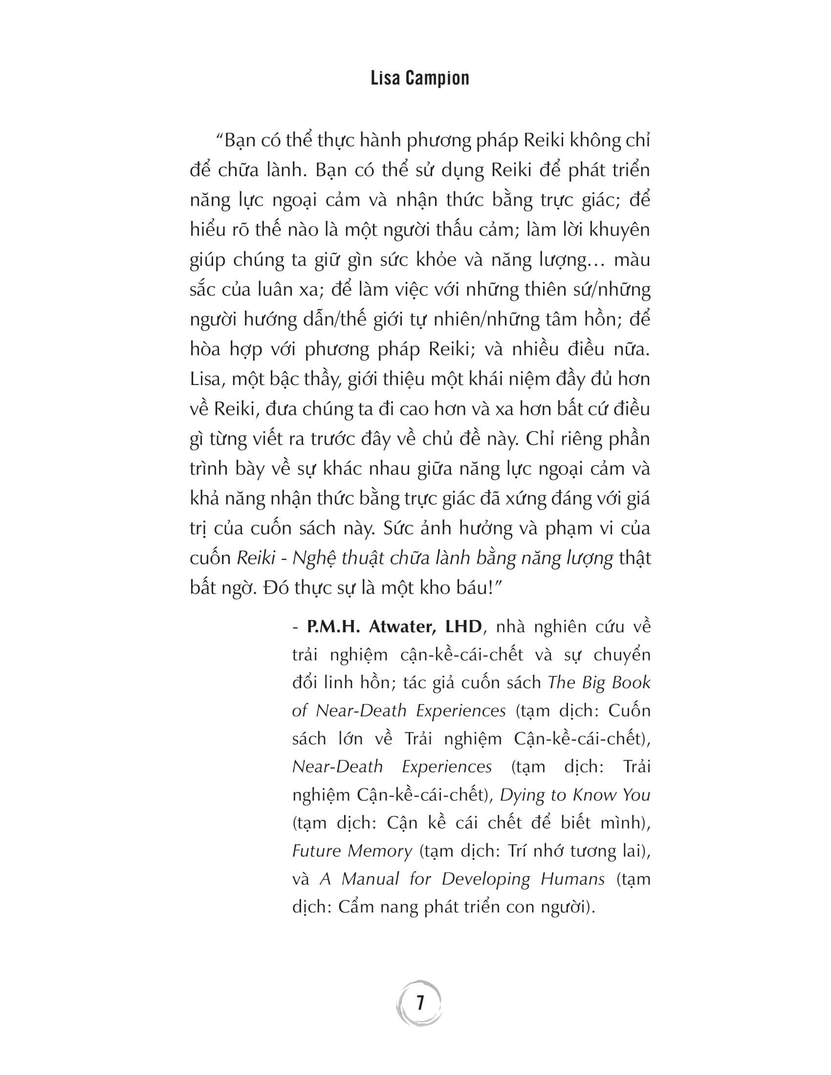 “Reiki là một trong những phương pháp chữa lành bằng năng lượng đơn giản và mang tính trực giác nhất. Là kỹ thuật chữa lành bằng năng lượng mang tính thực hành, hiệu quả, nhẹ nhàng, có nguồn gốc từ Nhật Bản, và ai cũng có thể học được.” “Giúp khai phá và phát triển năng lực bí ẩn trong bạn, giúp chữa lành những tổn thương, cân bằng tâm trí và cảm xúc.” Mọi người đều có trực giác, và nhiều người trong chúng ta có khả năng ngoại cảm. Chúng ta có thể phát triển những năng lực này nếu tập trung và hành động. Nếu bạn sở hữu tài năng tiềm tàng mạnh mẽ, đó sẽ là một phần mục đích sống của bạn và thật sáng suốt khi mài giũa chúng. Việc học Reiki có thể khai phá sự nhạy cảm tiềm tàng và năng lực ngoại cảm trong bạn. Nếu bạn đã sở hữu năng lực ngoại cảm và trực giác, trải qua những cấp độ thực hành Reiki, có thể bạn sẽ sở hữu nhiều năng lực hơn thế. Năng lực thấu cảm và ngoại cảm là bộ công cụ mạnh mẽ, hiệu quả của những người chữa lành. Nhận biết và phát triển năng lực thấu cảm và ngoại cảm nên là một phần của quá trình học tập Reiki. Nếu bạn đã biết mình có năng lực thấu cảm và ngoại cảm, việc học Reiki sẽ khai phá năng lực ấy sâu hơn và nhanh hơn. Cả năng lực chữa lành và ngoại cảm là những kết quả đi kèm cùng với sự phát triển về tinh thần, và Reiki là con đường hiệu quả giúp trưởng thành về tinh thần. Năng lực ngoại cảm tự nhiên sẽ tăng lên khi chúng ta trưởng thành về tinh thần. Nhưng, luôn có những va chạm, xung đột trên con đường ấy, đòi hỏi sự hòa hợp và phát triển, và Reiki giúp ích rất nhiều. Reiki – Nghệ thuật chữa lành bằng năng lượng sẽ giúp chúng ta hợp nhất năng lực thấu cảm, năng lực ngoại cảm và năng lực chữa lành một cách lành mạnh. Xuyên suốt cuốn sách này, sẽ có nhiều bài tập và bài thiền đa dạng, giúp các bạn khám phá những nguyên tắc của Reiki cũng như tiếp tục nâng cao hiểu biết và khả năng thực hành Reiki của mình. Reiki thực sự rất dễ hiểu, dễ tiếp cận, nên nó là cánh cổng tuyệt vời cho bất cứ ai muốn khám phá một người chữa lành, nhất là một người chữa lành bằng năng lượng là như thế nào. Và, bạn cũng sẽ được chữa lành trên con đường này. Nếu bạn yêu thích phương pháp Reiki và muốn nâng Reiki lên mức độ cao hơn, bạn đã chọn đúng cuốn sách mình cần. Lòng trắc ẩn và kinh nghiệm của một giảng viên, một người chữa lành, một người ngoại cảm, và một tác giả của Lisa sẽ biến hành trình thực hành Reiki đi sâu hơn vào việc chữa lành, biến điều đó thành một trải nghiệm làm thay đổi cuộc đời. Trích dẫn hay trong tác phẩm Chúng ta biết rằng cơ thể năng lượng của con người cũng có thực như thể xác. Nghĩa là chúng ta cần một thế hệ mới những người chữa lành, khám phá càng nhiều cách giải thoát khỏi những vết thương vô hình, và mở ra một cuộc sống khỏe mạnh hơn, tự do hơn ở mọi mức độ. Có những đặc trưng và tính cách của người thấu cảm giúp phân biệt họ với những người khác. Nếu bạn là một người thấu cảm, việc nhìn thấy bức tranh toàn cảnh có thể giúp bạn nhận thức được những thách thức bạn phải đối mặt trong cuộc sống. Những người thấu cảm rất nhạy cảm với cảm xúc của người khác giống như những đứa trẻ cảm nhận được cảm xúc của mọi người trong gia đình. Những người thấu cảm không thích đám đông và thường là những người hướng nội. Họ cảm thấy bị lấn át ở những nơi đông đúc, như rạp chiếu phim, siêu thị, sân bay, hoặc bệnh viện Reiki thực sự rất dễ hiểu, dễ tiếp cận, nên nó là cánh cổng tuyệt vời cho bất cứ ai muốn khám phá một người chữa lành, nhất là một người chữa lành bằng năng lượng. Thông tin về Tác giả Lisa Campion là một nhà tư vấn ngoại cảm và một bậc thầy Reiki với hơn hai mươi lăm năm kinh nghiệm thực hành và giảng dạy Reiki Ngoại cảm. Cô sống ở Boston, Massachusetts. Người viết lời nói đầu Rhys Thomas là tác giả của cuốn sách Discover Your Purpose (tạm dịch: Khám phá Mục đích sống của bạn), người sáng lập Trung tâm Y học Năng lượng Rhys Thomas, và sáng tạo Rhys Methods .