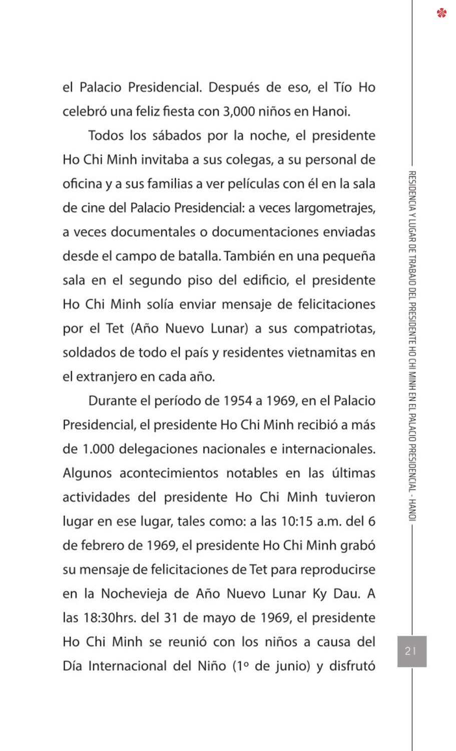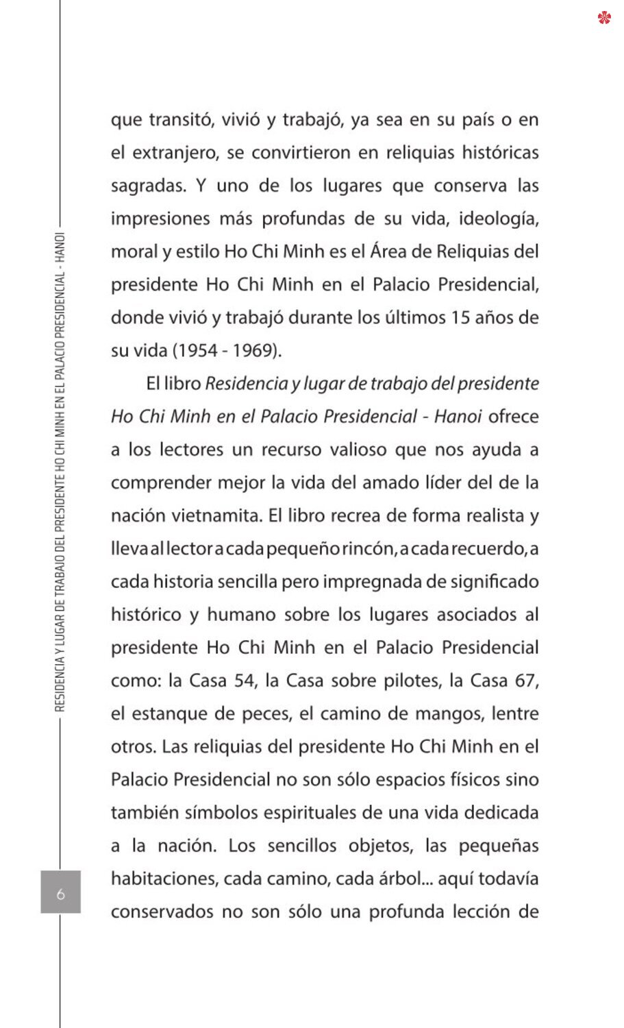 El libro Residencia y lugar de trabajo del presidente Ho Chi Minh en el Palacio Presidencial - Hanoi ofrece a los lectores un recurso valioso que nos ayuda a comprender mejor la vida del amado líder del de la nación vietnamita. El libro recrea de forma realista y lleva al lector a cada pequeño rincón, a cada recuerdo, a cada historia sencilla pero impregnada de significado histórico y humano sobre los lugares asociados al presidente Ho Chi Minh en el Palacio Presidencial como: la Casa 54, la Casa sobre pilotes, la Casa 67, el estanque de peces, el camino de mangos, lentre otros.