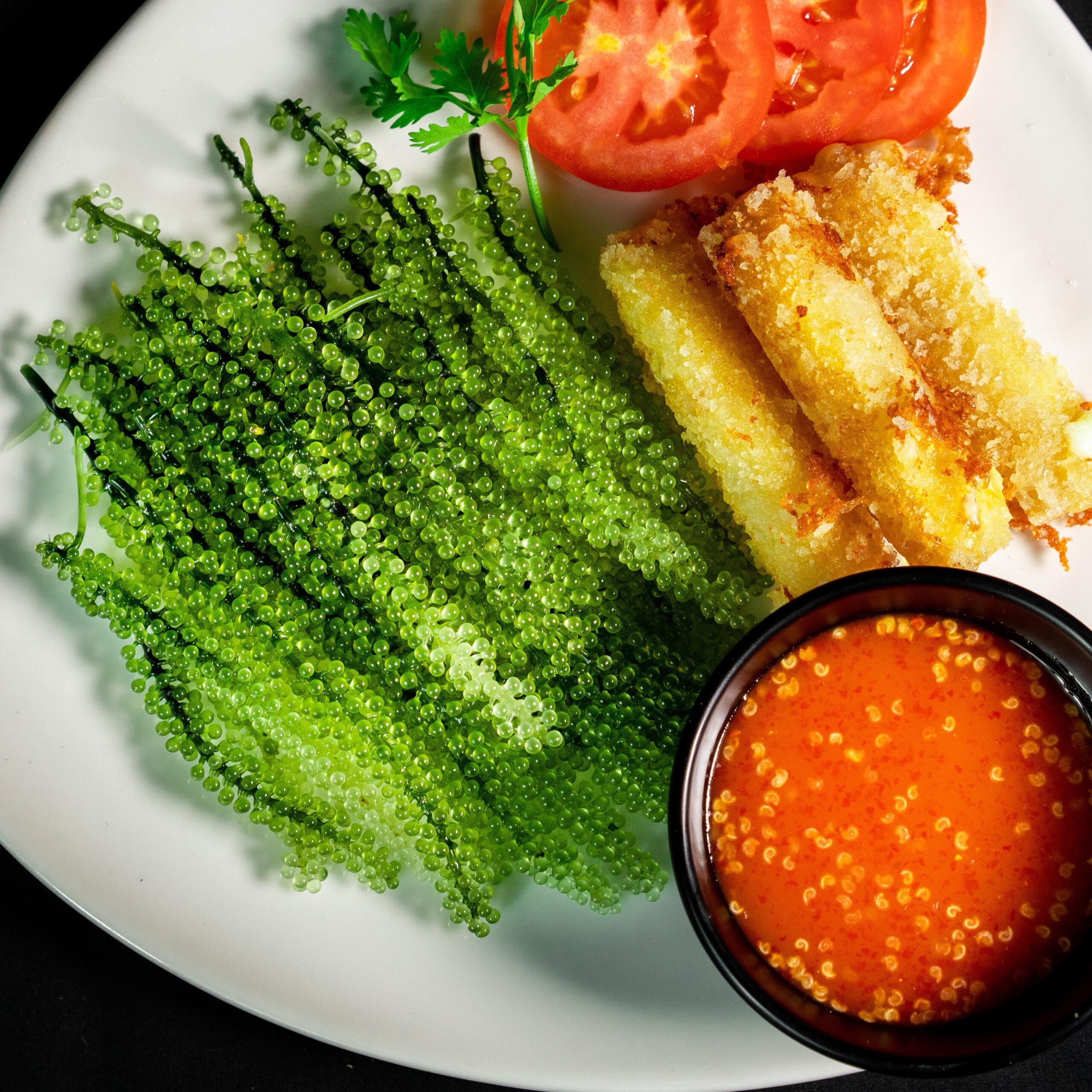 - Bước 3: Dùng ngay trong vòng 20 phút vì rong nho tươi sẽ xẹp lại “Dùng làm món ăn khai vị với các loại nước sốt khác nhau (Sốt mè rang, mù tạt, muối tiêu chanh, tương ớt, tương cà…). Hoặc dùng thay thế rau xanh và hải sản hằng ngày (Ăn với cơm trắng, rau sống, làm salad, sushi, sinh tố…). Hoặc đắp mặt nạ làm đẹp” Lưu Ý: Không chiên, xào, nấu chín hoặc đổ nước sốt trực tiếp vào rong nho tươi vì sẽ làm cho chúng xẹp lại