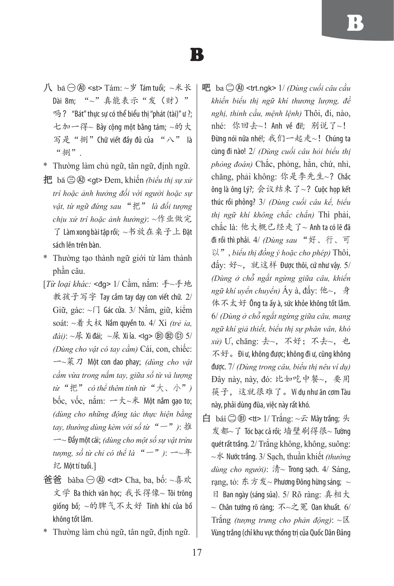 • Phiên âm, từ loại, nghĩa từ và ví dụ cho từng nghĩa: Một từ có thể có nhiều âm đọc (từ đa âm), nhiều từ loại (từ kiêm loại), nhiều ý nghĩa (từ đa nghĩa). Phiên âm và từ loại của từ được nêu lên trong phần này đều căn cứ vào tài liệu “Đại cương thi trình độ Hán ngữ” của Hanban và “Bảng thuyết minh 8000 từ tiếng Hoa” của SC-TOP (thí sinh có thể tham khảo thêm từ loại khác và âm đọc khác của từ ở phần giải thích mở rộng bên dưới). Trường hợp Trung Quốc và Đài Loan có âm đọc khác nhau thì âm đọc của Đài Loan sẽ được đặt trong dấu ngoặc vuông bên cạnh âm đọc của Trung Quốc. Đối với từ đa nghĩa, chúng tôi sẽ ưu tiên nêu những nghĩa thường dùng nhất của từ, đồng thời cố gắng nêu đầy đủ ví dụ minh họa cho từng chức năng ngữ pháp của từ (làm chủ ngữ, vị ngữ, tân ngữ, định ngữ, trạng ngữ, bổ ngữ trong câu).