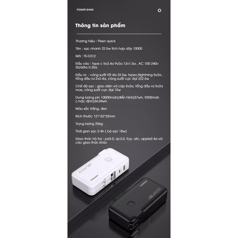 ✨Sạc dự phòng PISEN QUICK High Power Box 10000mAh, 22.5W OWN (TS-D312) kèm chân cắm, kèm cáp sạc, Hàng chính hãng