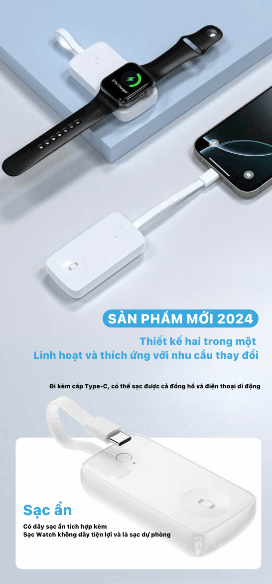 - Sạc đa năng 2 trong 1: Sản phẩm tích hợp khả năng sạc cho đồng hồ thông minh và thiết bị khác qua cổng Type-C, đảm bảo sự tiện lợi trong việc sạc đa thiết bị cùng lúc.
