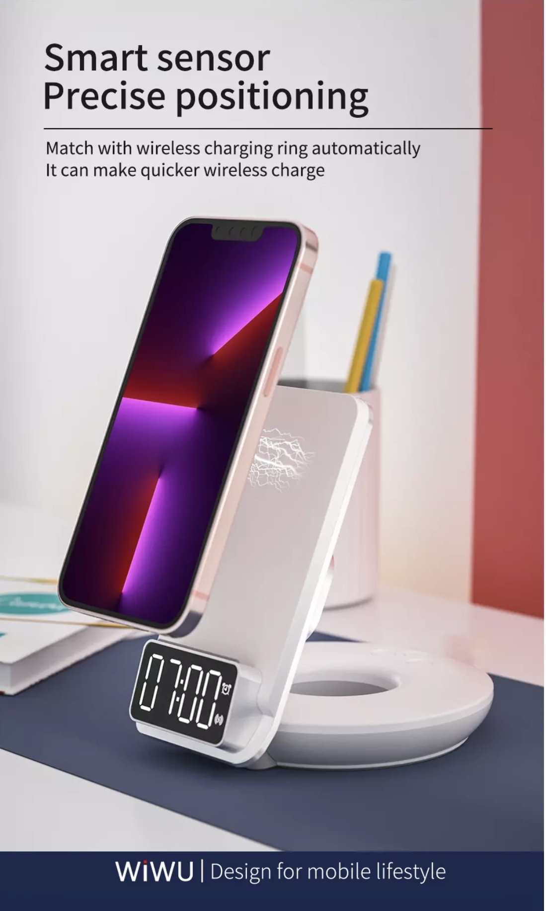 ✨Sạc Wiwu Automatic Positioning 4in1 M11 Cho Iphone, Airpods, Apple Watch hỗ trợ sạc nhanh không dây, sạc có đồng hồ hiện thị giờ - Hàng chính hãng