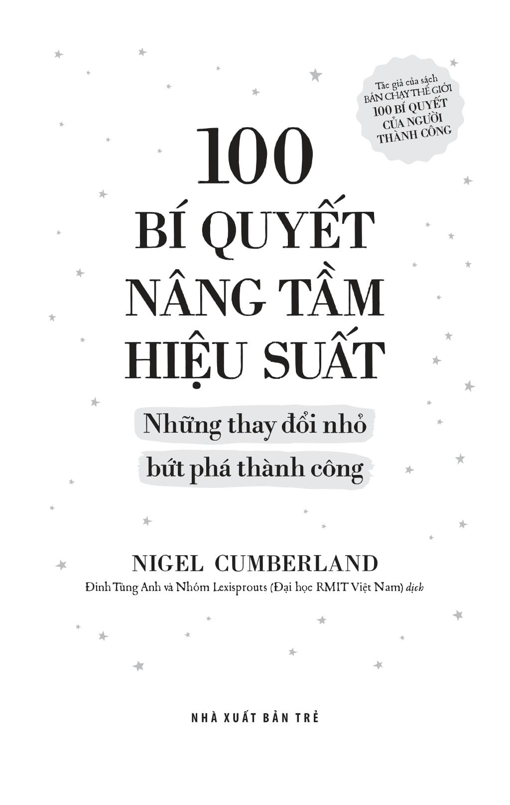 100 Bí Quyết Nâng Tầm Hiệu Suất - Những Thay Đổi Nhỏ Bứt Phá Thành Công Đây là cuốn sách hoàn hảo giúp bạn làm chủ những thói quen, kỹ năng và hành vi thiết yếu để trở nên hiệu quả về mọi mặt. 100 thói quen nâng tầm hiệu suất chứa đầy những ý tưởng tuyệt vời giúp bạn khám phá thói quen, công cụ, tư duy của những người có năng suất cao để làm việc thông minh hơn chứ không phải chăm chỉ hơn. Kết hợp những lời giải thích đơn giản với các hoạt động và bài tập, bạn sẽ học được kỹ năng và thói quen tối ưu để thành công.