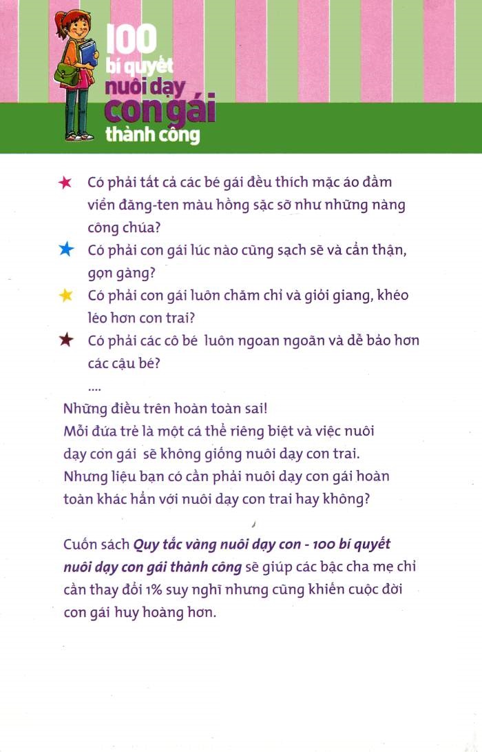 Với những nội dung hữu ích và các Quy tắc vàng nuôi dạy con, quyển sách "100 Bí Quyết Nuôi Dạy Con Gái Thành Công" sẽ giúp bạn trở thành một cha mẹ tốt và giúp con gái của bạn trở thành một cô gái hoàn thiện của thời đại. Hãy đặt mua ngay hôm nay để bắt đầu hành trình nuôi dạy con gái thành công!
