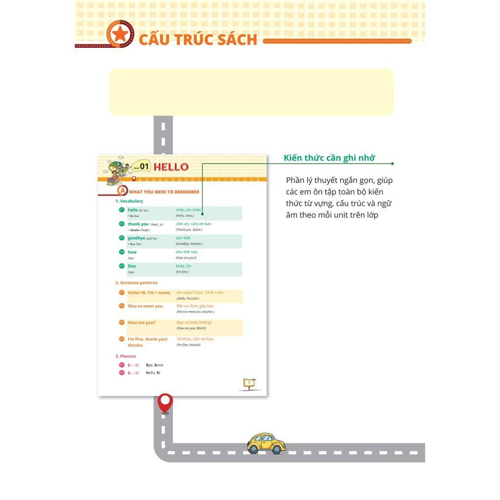 - Cấu trúc bài học chặt chẽ – Ôn tập toàn diện, ghi nhớ nhanh A. Kiến thức cần nhớ – What you need to remember Phần lý thuyết ngắn gọn, giúp các em ôn tập toàn bộ kiến thức từ vựng, cấu trúc và ngữ âm theo mỗi unit trên lớp B. Bài kiểm tra tổng hợp – Let’s put your memory to the test Bài kiểm tra tổng hợp các dạng bài tập thực hành: Trắc nghiệm chọn câu đúng, nghe và điền từ, tìm lỗi sai, nối, hoàn thành câu… C. Đáp án – Answer key Đáp án và lời giải chi tiết cuối sách giúp các em tự đánh giá lại mức độ thông hiểu và ghi nhớ, khắc sâu thêm kiến thức