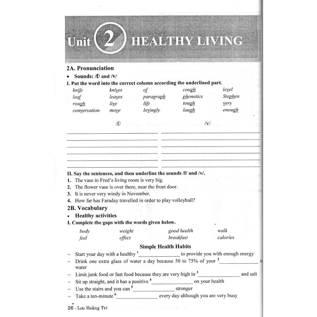 Bài tập dành cho mỗi đơn vị bài học gồm 6 phần: Pronunciation, Vocabulary, Grammar, Speaking, Reading, Writing, và một bài ôn tập dưới dạng Test gồm 80 câu hỏi kiểm tra với bài tập phát triển các kỹ năng trên.